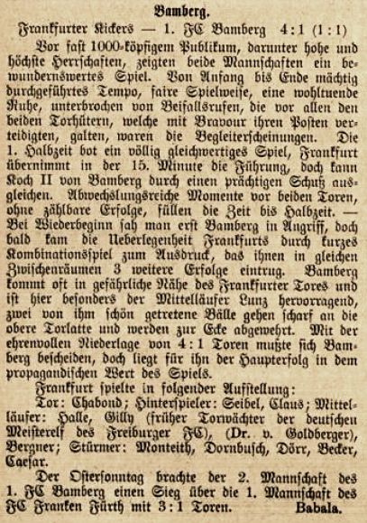 Die Osterreise der ersten Mannschaft. Ostermontag! Endlich nach fürchterlichem Schimpfen des Kapitäns ist die Mannschaft beisammen. Mit Verspätung gehts los — die Dummen in der III. Klasse zusammengepfercht, die Schlauen in der II. hingeräkelt. Kaum sind wir hinter Hanau, da bemerkt der weise Dornbusch: Jetzt kann man erst sehen, wie die weite Reise die fremden Mannschaften handicapt. Auf der Reise ist nicht viel los, Mittag sind wir in Bamberg, von einer Menge Leute empfangen und es geht zum Essen. Ohm Paul zeigt, daß er gut bayrisch spricht, während man das von Charbout nicht behaupten kann. Die vom Kapitän gemachte Reklame macht allen Spaß, besonders der „Stütze des Nordkreises." Dann gehts zum Spielplatz. Es ist sehr schön, aber auch sehr heiß. Und wir spielen mit dem Wind. Bei guter Kombination erzielt Becker das 1. Tor, dann werden zahlreiche Chancen ausgelassen, das Spiel liegt meist auf unserer linken Seite, wo Cäsar und Becker schön spielen, aber in der Mitte wird nichts verwandelt. Auch eine Menge Eckbälle bleiben ohne Erfolg. Dann paßt Seibel — zum ersten Mal in seinem Leben — der Paß wird abgefangen, halblinks brennt durch und ein schöner Schuß stellt das Spiel auf 1:1. So bleibts bis zur Pause. Nach häufigem Photographieren gehts wieder los. Bamberg drückt zuerst, aber wir machen uns bald frei und Becker erzielt das 2. Tor. Jetzt ist unsere Mannschaft sehr überlegen, es wird viel und gut geschossen, der feindliche Keeper wird nervös, Dörr und Becker drücken das 3. Tor ein. Ohm Paul, angestachelt von einem Artikel der „Sonne" schießt mehrmals schön, doch ohne Erfolg. Dann erhält Dornbusch einen Tritt und scheidet aus. Jetzt preßt Bamberg gefährlich, aber unsere Verteidigung hält alles, und schließlich erzielt Becker das 4. Tor und dann ist Schluß. Wir hatten 4:1 gewonnen. Der Schiedsrichter, Herr Steinberger vom F.-C. Bamberg war sehr gut. Dann große Wäsche und Massage. Herr W. C. Mac Friedheim wird zum Assistent-Trainer ernannt und darf als solcher Wasser zum Fußwaschen holen. Der Ohm ist ganz mager geworden und sucht durch mehrere Mäßchen sich wieder auf den normalen Umfang zu bringen. Im Klublokal des F. C. Bamberg gings hoch her. Der Centrehalf von B. war sehr populär und mußte das mit einer Runde büßen. Der Louis sang vorzüglich und so viel Schweinereien wie an diesem Abend habe ich noch selten gehört. Es wurde wenig aber gut gesprochen, und viel, aber gut gesoffen. Unter großem Lärm gings zur Bahn und mit Mühe und Not wurde „die Blase" einwaggoniert. Dann begannen „die Betäubten"' mit jedem