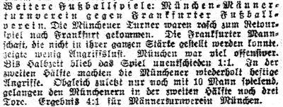 Frankfurt a. M. Fußballmannschaft des Männer-Turnverein „München" — Frankfurter Fußballverein 4:1. (Pause 1:1.) Der Frankfurter Fußballverein trat auf eigenem Platz dem Münchener Männerturnverein zum Rückspiel gegenüber. Um es vorweg zu nehmen, die Gäste hinterließen in Frankfurt den allerbesten Eindruck. Weniger wohl durch ihre Leistungen als durch ihr in jeder Hinsicht und Situation faires Spiel. Die einheimische Mannschaft vermochte in keiner Beziehung zu gefallen. Einigermaßen ging noch die Verteidigung und das auch nur vor Halbzeit. Von der Läuferreihe war unbedingt Kaufmann als Linker der Beste, während die beiden anderen nicht auf der Höhe ihrer Leistungsfähigkeit standen. Ueber den Sturm ist nicht viel zu sagen. Die Flankenleute versagten fast vollständig, bei den Gästen war der Mittelläufer sehr gut, auch die beiden anderen waren, wie bereits gesagt, auf der Höhe. Ueber Bork im Tore ist kein Wort zu verlieren. Er hielt alle Bälle, die aufs Tor kamen. Der einzige Erfolg, der von Frankfurt erzielt wurde, war nicht zu verhindern. Die beiden Verteidiger waren sich ihrer Aufgabe bewußt und der Sturm bewies durch sein verständnisvolles Spiel, daß er Kombinationsvermögen besitzt. Es entwickelte sich bald ein wechselvolles Spiel, das beide Torwärter zum Eingreifen zwang. Bei Frankfurt spielte zum ersten Male in der ersten Mannschaft Löffler, der frühere bekannte Torwächter der Bockenheimer Fußballvereinigung. Er entledigte sich in der ersten Hälfte seiner Aufgabe in sehr guter Weise. Auch Bork hielt verschiedene, wenn auch nicht sehr scharfe Schüsse des Frankfurter Linksinnen. Die Flankenstürmer Münchens waren den einheimischen bei weitem überlegen, namentlich wußte der Rechtsaußen sehr zu gefallen. Bei einem Vorstoß wurde er etwas unsanft von dem linken Verteidiger Frankfurts bedrängt. Es gab Strafstoß, der schön zum Mittelläufer gespielt wurde; dieser verwandelte scharf. Frankfurt gab sich hierauf alle Mühe, gleich zu ziehen, was auch kurz vor Halbzeit durch einen verwandelten Eckball gelang. Die Einheimischen hatten kurze Zeit ohne ihren Rechtsaußen Becker spielen müssen, wohingegen allerdings München seinen Linksaußen, der durch eine Karambolage spielunfähig wurde, während des Restes der Spielzeit entbehren mußte. In der zweiten Hälfte spielte vorerst Frankfurt etwas überlegen, ohne indessen bei der guten Verteidigung der Gäste etwas auszurichten. München wußte, obwohl nur mit 10 Mann spielend, doch das Treffen offen zu halten und — zu gewinnen. Die Stürmerreihe verstand sich bedeutend besser wie die einheimische und der Erfolg blieb denn auch nicht aus. Die drei folgenden Tore fielen in gleichen Abständen kurz vor Schluß. Eins wäre wohl zu halten gewesen, an den beiden anderen aber konnte Löffler nichts machen. Er war einmal in richtiger Erkenntnis der Situation herausgelaufen, doch versagten in diesem Momente die beiden Verteidiger, die das Tor ungedeckt ließen. Der Ball rollte unbehindert in das leere Heiligtum. Sehr anzuerkennen ist der durchaus faire Spielverlauf, der nicht zum Wenigsten durch die gute Leitung des Schiedsrichters gefördert wurde. (aus 'Fußball und olympischer Sport', Ausgabe 20/1912 vom 13.05.1912)