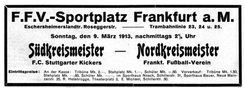 Das entscheidende Tor fiel etwa in der 25. Minute durch Dornbusch. Jockel hatte den Ball vorgegeben, Kühnle war etwas zu weit aufgerückt. Dörr köpfte über ihn hinweg zu Dornbusch und beide strebten dem Tore zu. Schmidt war nicht sicher, wer schießen würde, und Dornbusch, der als alter Praktiker die Situation gut auszunutzen verstand, täuschte Schmidt gewandt, der den Ball nicht halten konnte. Als sich der Applaus gelegt hatte, kam noch mehr Leben in beide Mannschaften. Kickers versuchten, das verlorene Terrain wieder zu gewinnen, Frankfurt den Vorsprung zu halten. Es kamen bange Minuten für die Frankfurter Verteidigung und die Folge war, daß die Stuttgarter einige Ecken erzielten. Sämtlich wurden sie gut hereingegeben und schufen immer gefährliche Situationen. Den ersten Eckball köpfte Löble haarscharf über die Stange. Auch beim zweiten hätte nicht viel gefehlt, und Stuttgart hätte das ausgleichende Tor erzielt. Der Ball ging aber wieder daneben. Die Entscheidung lag jetzt in der Ausdauer. Wenn Frankfurt nicht locker ließ, war der Mannschaft der Erfolg nicht mehr zu nehmen. Was niemand für möglich gehalten hatte, geschah. Die Angriffskraft der Kickers ließ nach und die Einheimischen hatten keine allzugroße Mühe, den Vorsprung zu halten. Unter lebhaftem Applaus verließ der Frankfurter FV als einwandsfreier Sieger den Platz. Die Spielweise der beiden Mannschaften ähnelt sich sehr, was ja auch nicht zu verwundern ist, wenn man bedenkt, daß die Stuttgarter Kickers in gewisser Hinsicht die Lehrmeister des Frankfurter Fußballvereins in früheren Jahren gewesen sind. Das Kombinationsspiel haben sich die Frankfurter nach mancher Niederlage angeeignet und es war eine helle Freude, heute zu beobachten, in welcher Weise sie auf die Höhe gekommen sind, der sie von jeher zugestrebt haben. Auch heute lieferten die Stuttgarter Kickers wieder die vorbildliche Spielweise. Aber es liegt ein gewisses Etwas darin, das man nicht schlechthin als Lässigkeit bezeichnen darf. Man erinnert sich wohl unwillkürlich an die Niederlage der Stuttgarter Kickers seinerzeit in Berlin im Endspiel um die Deutsche Meisterschaft. Auch damals wurde unumwunden zugegeben, daß die Kombination und Technik der Stuttgarter, das präzise Zusammenspiel und die vorteilhafte Ballbehandlung überragend gewesen war. Was aber der Mannschaft fehlte, das war die Energie vor dem Tore und die hat ihr damals die höchste Würde gekostet. Es ist ja unter der Leitung des neuen Trainers schon etwas mehr Zug nach dem Tore in die Mannschaft gekommen. Es steht auch zu erwarten, daß die Spielweise in Zukunft eine produktivere wird. Von mancher Seite wird angenommen, daß der Volkscharakter eine gewisse Rolle spielt. Mag dem nun sein, wie es will, wenn in einer Stürmerreihe so tüchtige Kräfte, wie Löble und Ahorn stehen und die Mannschaft kann bei gutem Zusammenspiel kein Tor erzielen, dann fehlt vorn der durchgehende Zug, der beispielsweise ein großer Vorteil der Berliner Viktoria ist. Die Stuttgarter Kickers hatten dies ja auch damals am eigenen Leibe erfahren müssen. (aus 'Fußball und olympischer Sport', Ausgabe 20/1913 vom 10.03.1913)