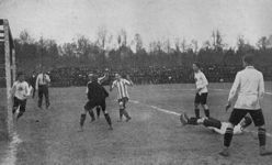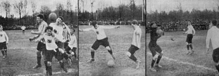 Der Ausgang der südd. Meisterschaft war durch zwei Proteste erheblich bedroht, nun sind diese Einsprüche abgelehnt wie folgt: 1. Protest des VfR Mannheim gegen das Verbandsschlußspiel mit FC Stuttgarter Kickers am 23.3.1913. Urteil: der Protest wird abgelehnt, die Gebühr verfällt. Begründung: Die Verletzung des Spielers durch den ins Spielfeld eingedrungenen Hund ist, da eine Absicht oder auch nur eine Fahrlässigkeit von Kickers dem ganzen Hergange nach nicht vorliegt, ein unglücklicher Zufall und muß auch als solcher beurteilt werden. Wird nun das Ausscheiden eines Spielers durch eine Verletzung veranlaßt, so gründet sich darauf kein Anspruch auf Spielwiederholung. — Bei diesem Standpunkt brauchte der Frage, ob die erlittene Verletzung eine solche war, daß sie die Möglichkeit, weiter zu spielen, tatsächlich ausschloß, nicht näher getreten zu werden. — Zu der Beanstandung des Platzes sei bemerkt, daß über die Spielfähigkeit des Platzes ausschließlich der Schiedsrichter entscheidet. — Der angeführte Regelverstoß (Abstoß statt Schiedsrichterball) muß angesichts des Endresultats (5:0) sowie des Spielstandes zur Zeit des Vorfalles (3:0) als unwesentlich angesehen werden. 2. Protest der Spielvereinigung Fürth gegen das Verbandsschlußspiel mit Frankfurter FV am 24.3.1913. Urteil: der Protest wird abgelehnt, die Gebühr verfällt. Begründung: Sowohl über die Spielfähigkeit des Platzes und die Möglichkeit, trotz Unwetters weiter zu spielen, als auch darüber, ob ein Tor regelrecht erzielt wurde, entscheidet ausschließlich und endgültig der Schiedsrichter. (Vergl. amtl. Bekanntmachung im Mittwochsheft.) Stuttgarter Kickers — Frankfurter Fußballverein 1:0(1:0). Der große Tag ist vorüber, Stuttgart hat seine Sensation gehabt. Im letzten, entscheidenden Treffen um den Südd. Meistertitel, gelang es den Kickers nach erbittertem Kampf, den Nordkreismeister, Frankfurter Fußballverein, welcher heißer Favorit war, mit 1:0 einwandsfrei zu besiegen und werden die Kickers nun, den höchsten Titel, welchen Süddeutschland zu vergeben hat, einnehmen, vorausgesetzt, daß der Verband, der über die Protestsache Kickers — VfR Mannheim zu verhandeln hat, nicht noch einen Strich durch die Rechnung macht. Zu diesem bedeutungsvollen Treffen fand sich eine Rekordzuschauermenge ein (es mögen immerhin 6—7000 Personen gewesen sein), um Zeuge zu sein, ob es den Kickers gelingen wird, die Ehre des Südkreises zu retten und den Meistertitel zum zweiten Mal nach Stuttgart zu bringen. Wie das Resultat schon angibt, ist ihnen dies gelungen, aber nur ganz knapp. In der 1. Hälfte leicht im Vorteil gelang es ihnen, mit Hilfe des Frankfurter Torwarts einen Ball einzudrücken, der die Entscheidung bringen sollte. Nach der Pause verlegten sie sich mehr auf die Verteidigung und mußten bange Minuten überstehen, aber das Glück blieb diesmal auf ihrer Seite, denn dem dann stark drängenden Gegner blieb der verdiente Ausgleich, der ihm zugleich die Meisterschaft gebracht hätte, versagt. Stürmisch begrüßt betraten beide Mannschaften den fein gezeichneten Platz, auf dem die Südd. Meisterschaft entschieden werden sollte. Kurze Zeit darauf erschien der Protektor der Kicker, Herzog Ulrich v. Württemberg, ebenfalls sehr lebhaft vom Publikum begrüßt. Schiedsrichter Kehm gab sofort das Zeichen zum Beginn. Kickers eröffneten das Spiel und gingen gleich zum Angriff über. Beide Mannschaften waren aber zuerst sehr aufgeregt und spielten ziemlich zerfahren, erst allmählich legte sich die Unruhe. Kickers fand sich zuerst zusammen und wurden dem Frankfurter Tor durch 2 Strafstöße gefährlich. In der 8. Minute hatte Gmelin im Frankfurter Tor einen fein plazierten Ball Häußler's abzuwehren; eine Ecke für Kickers wurde ins Feld gebracht, der Ball ging dann zu Leissing, der nach gutem Flankenlauf fein zenterte und Schmidt im Stuttgarter Tor konnte noch im letzten Moment dem feindilchen Stürmer den Ball vorm Fuß wegnehmen.
