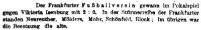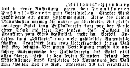 Viktoria Neu-Isenburg beteiligt sich an der Mainpokalrunde und ging als aussichtsreichster Bewerber zu den Spielen. Leider brachte schon der erste Tag eine herbe, aber selbst verschuldete Enttäuschung. Mit 7 Mann Ersatz antretend, mußte die I. Mannschaft in Mülheim gegen Kickers Viktoria sich mit 2:0 geschlagen bekennen. Gegen Vereinigung Fechenheim errang sodann die Mannschaft einen verdienten 3:1-Sieg. Isenburg war hier weitaus besser, spielte mit mehr System, die Gäste konnten wenig gefährlich werden. Eine Unterbrechung brachte das Pokalspiel um den süddeutschen Pokal gegen den Frankfurter Fußballverein. Vor einer ansehnlichen Zuschauermenge, zur Hälfte Frankfurter zur anderen Hälfte Isenburger, kam dieser spannende Kampf auf dem F.V.-PIatz in Frankfurt zum Austrag. Viktoria, die Sache sehr ernst nehmend, spielte von Anfang sehr aufopfernd, jedoch machten die neuen Leute im Sturm durch das Sichnichtverstehen die schönsten Aussichten zu Wasser. Immerhin hatte Gmelin im Tor oft genug Gelegenheit, sein Können zu beweisen, aber die Schüsse waren zu schwach. Gegen Ende der ersten Hälfte prallt der Torwächter Isenburgs beim Herauslaufen mit dem Mittelstürmer Frankfurts zusammen und der Halbrechte kann mühelos einsenden, so seinem Verein die Führung gebend. Viktorias Rechtsaußen bricht gleich darauf auf der Außenlinie gut durch, kommt bis vors Frankfurter Tor, allgemein sieht man den Ausgleich, aber der linke Verteidiger hält ihn am Armgelenk und verhindert so den Schuß. Trotz Reklamation läßt sich der Schiedsrichter nicht belehren, die Folge ist, daß das Spiel beiderseits an Schärfe zunimmt. Viktorias Kombinationsspiel war besser, aber F.V. ersetzte dieses Fehlen durch größere Schnelligkeit. In der 2. Hälfte vermag Viktoria einige Zeitlang stark zu drängen, die Hintermannschaft hat schwere Arbeit zu verrichten, aber der Ausgleich will nicht gelingen. Noch einmal gelingt es dem Halbrechten, gut durchzuspielen, er wird im Strafraum unfair zu Fall gebracht, aber umsonst, der Schiedsrichter sieht auch diesen Verstoß nicht. Becker vom F.V. leistet sich die schwersten Stückchen, und er kann es auch, sonst hätte er es sicher unterlassen, aber der Schiedsrichter hat sich das Spiel aus der Hand gegeben. Gegen Ende des Spieles gelingt F.V. der zweite Erfolg, der Isenburger Torwächter geht zu spät aus dem Tor und der Halbrechte kann wieder ins leere Tor einsenden. Viktoria kann mit dem Ausgang zufrieden sein, etwas mehr Aufmerksamkeit des Schiedsrichters, und der Ausgang hätte anders sein können. (Fußball vom 05.05.1920)