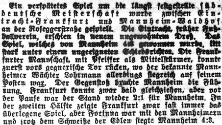 Fußball im Reich Mannheim-Waldhof schlägt den Frankfurter Fußballverein (jetzt Eintracht 1861) mit 4:3 In den Platzierungskämpfen um die Süddeutsche Meisterschaft konnte sich Mannheim Waldhof mit obigem Resultat zwei wertvolle Punkte holen. Der Spielverlauf war kurz folgender: Frankfurt ist zuerst vor Waldhofs Tor, wo Lohrmann schon gleich in Aktion treten muss. Einige Angriffe der Gäste folgen, wobei Höger, nachdem die Verteidigung zu weit aufgedrungen ist, mit gutem Schuß das erste Tor für seine Farben erzielen kann. Die Stürmerreihe der Gäste zeigt nun ein wohldurchdachtes Kombinationsspiel, so daß die Eintrachtverteidigung sich tapfer wehren und Gmelin wiederholt eingreifen muss. Einen von Jockel gut angegebenen Ball weiß Pfeiffer nach Umspielen der Mannheimer Hinterleute für Lohrmann unhaltbar einzusenden. 1:1. Allmählich werden nun Frankfurts Angriffe gefährlicher; die Läuferreihe unterstützt gut, und besonders vom rechten Flügel kommt manche schöne Flanke, - die durch wiederholtes Abseitsstehen verloren geht. Das Tempo wird nun sehr lebhaft; auch Mannheim erscheint wieder einige Male vor Frankfurts Heiligtum, wo kritische Momente entstehen. Höger erhält in offensichtlicher Abseitsstellung den Ball und schießt scharf ein. Gmelin klärt den Schuß gut, kann jedoch das Leder nicht schnell genug vorbringen, so daß der Halblinke der Gäste den Stand auf 2:1 bringen kann. Kurz drauf ist Halbzeit. Bei Widerbeginn ist Eintracht sofort wieder vor Waldhofs Tor, wo Lohrmann einen Prachtschuß Imkes nur knapp zur Ecke abwehren kann. Bald darauf erhält Pfeiffer eine einzigartige Gelegenheit gleichzuziehen, jagt jedoch den Ball übers leere Tor. Frankfurt hat in dieser Zeit entschieden mehr vom Spiel, obwohl die vereinzelten Durchbrüche Mannheims stets sehr gefährlich sind. Bei einer solchen Gelegenheit läßt Gmelin einen zahmen Schuß Hutters passieren, jedoch kann Imke einige Minuten später eine Vorlage Schönfelds verwandeln und somit den Stand auf 2:3 bringen. Waren die Entscheidungen des Schiedsrichters bis dahin manchmal zweifelhaft gewesen, so übersieht er jetzt kurz nacheinander drei "Abseits"-Bälle. Beim letzten appelliert Lohrmann heftig und läßt den Schuß Pfeiffers ruhig passieren. 3:3. Der Mannheimer Mannschaft bemächtigt sich nun eine große Aufregung und Spielführer Lohrmann will das Spielfeld verlassen. (Oder suchte er einen anderen Schiedsrichter?) Wie dem auch sei, so war sein Benehmen doch nicht "sportmanlike", mag der Schiedsrichter nun gut oder schlecht sein. Im übrigen hatten beide Parteien gleichmäßig unter den Entscheidungen des Schiedsrichters zu leiden. Nachdem Beruhigung eingetreten ist, wird das Spiel fortgesetzt mit ständigen Angriffen Frankfurts, jedoch bleibt der Erfolg aus. Kurz vor Schluß weiß Mannheim nach einem Durchbruch noch ein weiteres Tor zu erzielen, so daß mit dem Ergebnis 4:3 die beiden Punkte nach Mannheim wandern. (Mittelrheinische Sportzeitung vom 18.05.1920)