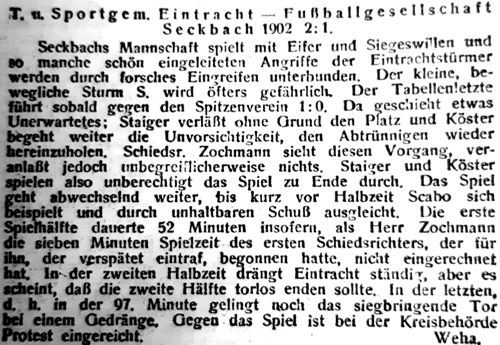 Termin: 12.12.1920 Zuschauer: Schiedsrichter: Zochmann Tore: 0:1 Krapp, 1:1 Szabo, 2:1 Szabo (88.). >> Spielbericht <<