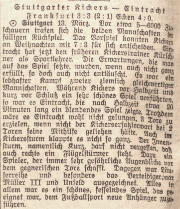 Das Treffen Kickers — Eintracht Frankfurt fand große Beachtung. Beide Mannschaften sind in den Kämpfen um die Kreismeisterschaft ihren Gegnern unterlegen. Beide Mannschaften stehen oder standen unter dem Training des gleichen Trainers. So war man hier, nachdem die Kickers vergangene Weihnachten in Frankfurt einen kräftigen 7:3-Sieg über Eintracht erringen konnten, auf das Rückspiel natürlicherweise sehr gespannt. Die Frankfurter Eintracht, die sich in der Zwischenzeit durch den Übertritt von Sachsenhausen erheblich verstärken konnte, setzte alles daran, die damalige hohe Niederlage auszugleichen. Über das Spiel selbst, ist noch folgendes zu bemerken: Die erste halbe Stunde sah es aus, als ob die Eintracht von neuem eine kräftige Abfuhr erleiden sollte, da Kickers in kurzer Zeit drei Tore erzielen konnten, von denen aber nur zwei gewertet wurden. In dieser Zeit spielten die Kickers taktisch richtig und vermochten auch die gegnerische Verteidigung derart konfus zu machen, daß unter Beibehaltung der angewandten Taktik die Niederlage Eintrachts ohne Zweifel außer Frage gestellt worden wäre. Unbegreiflicherweise ließen sich, insbesondere in der zweiten Halbzeit, die Kickers zu einem schematisierten Innenspiel verleiten, das an der wiedererstarkten Frankfurter Verteidigung rettungslos verpuffen mußte. So konnten wir wahrnehmen, daß in der zweiten Halbzeit der rechte Fügel der Kickers, der heute eine Klasse für sich bildete, nur drei oder viermal beschäftigt wurde. Anders bei Eintracht. Nach dem ersten Ansturm, unter welchem die Mannschaft bedenklich erschüttert wurde, fand die Elf die Ruhe und sich selbst. Ausgesprochen wurde diese Tatsache vollends, als Egly als Mittelläufer zurückgenommen wurde, der nun Außerordentliches leistete. In dem Maße, wie Kickers in der ersten Halbzeit überlegen war, war es die Eintracht zwei Drittel der zweiten Halbzeit. Immer war es Szabo, der mit wundervollen Einzelleistungen den Sturm mit nach vorne trieb, in dessen Mitte Willi Pfeiffer prachtvoll spielte. Szabo hatte einen außerordentlich guten Tag, er spielte ähnlich wie damals im Juni 1919, als er mit Schlosser den linken Flügel des M.T.K.-Sturmes bildete. Wenn die in der zweiten Halbzeit vermerkte Überlegenheit Eintrachts nicht zu Erfolgen führte, so lag dies an dem fehlerfreien Verteidigerspiel der Kickersmannschaft. Unseld übertraf sich selbst; nur er erfaßte die Lage taktisch richtig und mit weiten, flachen Schlägen legte er dem Rechtsaußen Müller II Bälle vor. Alles in allem: die Mannschaften hielten sich die Waage. Müller I spielte für den erkrankten Götz im Tore, hatte aber einen schlechten Tag. Schiedsrichter war Herr Witte. Mit einer peinlichen Genauigkeit führte er dieses Spiel durch. (aus dem 'Fußball', Ausgabe 11/1922)
