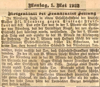 Nürnberg-Fürther Echo 1. F.C.N. schlägt Eintracht Frankfurt 6:2 (2:1) Das Spiel hatte eine besondere Note durch das erstmalige Mitwirken des neuen Klubmittelstürmers Wieder. Außerdem spielte der bekannte Fürther Schmidt das erstemal auf dem Klubplatz und zwar als rechter Läufer. Sonst war der Klub bis auf Kugler komplett. Der Platzinhaber spielte schmissig und mit Elan. Kraftvolle Torschüsse, die direkt erfrischend wirkten. Von der zeitweise gezeigten saftlosen Überkombination keine Spur mehr. Trag und Popp die gewürfelten Taktiker, nur Trag glücklicher in seinen Torschüssen. Sutor wieder der bewährte Flatikentechniker. Wieder, ein kräftiger Mittelstürmer, der sich durchzusetzen versteht. Sein Start im Felde war mir noch etwas zu langsam und unentschlossen. Seine Vorlagen an die Halbstürmer und sein entschlossenes Ausnützen von Torgelegenheiten sprechen sehr für sein Können. Dazu kommt noch ein eleganter, scharf berechnender Torschuß und eine vorzügliche Technik. Mehr kann man von einem Mittelstürmer nicht verlangen. Wieder schoß allein drei Tore; davon eines mit allen Finessen. Ein Genuß für den Fußballgaumen. Überhaupt war der ganze Klubsturm sehr schußfreudig und entwickelte zeitweise ein so bestechendes Kombinationsspiel, daß die Zuschauer in helle Begeisterung versetzt wurden. Kalb machte zeitweise einen etwas überspielten Eindruck; auch hatte er anscheinend mit einer Verletzung zu kämpfen. Sonst machte er den Frankfurtern schwer zu schaffen und holte die Bälle aus allen Gegenden. Riegel machte seine famosen Täuschungsmanöver und zog alle Register seines technischen Könnens. Schmidt befriedigte ebenfalls, doch machte er den großen Fehler, sich in der Verteidigung aufzuhalten, wodurch dem Szaboflügel mehr als einmal der Weg nach Rom offenstand. Grünerwald-Bark zeigten sich der Situation vollkommen gewachsen; wenn Grünerwald hier und da einige Kisten fabrizierte, so glich er dies bei der nächsten Gelegenheit durch zielbewußtes Dazwischenfahren reichlich wieder aus. Stuhlfaut hielt einen unheimlich scharfen Elfmeter und machte sonst seinem Namen alle Ehre. Die beiden Tore kommen auf das Konto seiner Vorleute. Die Gäste enttäuschten nach der angenehmsten Seite. Eine flinke, falsche Kombination, gutes Stellungsvermögen und ein gesunder Torschuß trugen dem Sturm auch zwei Tore ein. Wenn Szabo durchkam, wurde die Sache sehr haarig. Gleich fünf Minuten nach Beginn führten die Gäste auf eine Linksflanke hin mit 1:0. Die Läuferreihe arbeitete aufopfernd und unterstützte den Sturm, so gut es ging. Der linke Läufer machte dem kleinen Strobel das Leben recht sauer. Die Verteidigung ist auch gute Ligaklasse. Der Torwart hielt manche Sachen ganz schön und stilvoll, versagte aber im großen und ganzen. Er stand bei etlichen Toren sozusagen machtlos vis-a-vis. Er hätte zwei Tore halten können. Der Schiedsrichter Nepf vom T.V. 60 Fürth machte seine Sache nicht schlecht; er hatte schwarze Momente, die aber jeder andere Schiedsrichter auch schon hatte. Auf keinen Fall durfte er den Mittelstürmer Pfeiffer der Gästeelf länger auf dem Spielfeld lassen. Herr Pfeiffer hatte wegen der nicht gegebenen Ecke keinen Anlaß, den Schiedsrichter wie einen dummen Buben anzuraunzen. Ich habe schon ganz andere Schiedsrichter gesehen, die bei Spielen von Bedeutung zuerst Ecke gaben und dann auf Reklamation Abstoß machen ließen, und auf weitere Reklamation wieder Ecke gaben. Alles schon dagewesen und Herr Pfeiffer brauchte nicht so unangenehm aufzufallen. (aus dem 'Fußball', Ausgabe 18/1922)