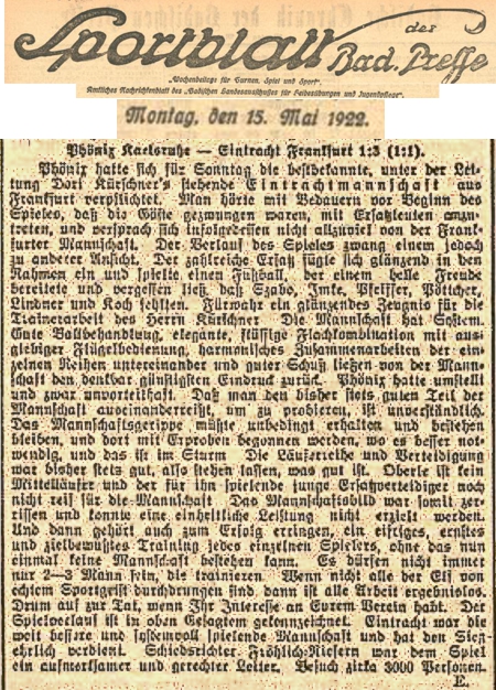Frankfurter Neuigkeiten Mit reichlichem Ersatz hatte vor acht Tagen Eintracht in Karlsruhe gegen die komplette Phönix-Elf 3:1 gewonnen. Das gleiche Experiment probierte Phönix beim Rückspiel in Frankfurt, und siehe da, sie siegten auch 3:1. Die Eintrachtmannschaft mußte noch geschwächter antreten, weil der Mittelläufer Egly in Hanau beim Dr.-Rat-Popper-Gedächtnisspiel weilte. Phönix war die körperlich stärkere Elf mit ausgeprägter Kopfarbeit. Eintracht zeigte vor Halbzeit Feldspiel, wie man es sich nicht schöner denken kann. Aber vor dem Tore schien der Sturm von allen Göttern verlassen. Was die fünf Stürmer an geschaffenen Torgelegenheiten ausließen, zum Teil wenige Schritte vor dem Hüter stehend, ist kaum zu glauben. Die Karlsruher Angriffe scheiterten vorerst an dem Bollwerk Kirchheim, der als Mittelläufer Hervorragendes leistete. In der 30. Minute führte ein kunstvoll durchgeführter Gästevorstoß durch Schwarzkopf zum ersten Tor für Karlsruhe. Eintracht konnte trotz deutlicher Überlegenheit das Tor nicht finden. Wenn einmal etwas fertig gebracht wurde, dann war es Lorenz im Gästetor, der in prächtiger Arbeit alle Hoffnungen zunichte machte. Nach der Pause wurde der Kampf ausgeglichen. Phönix schien die große Hitze nicht zuzusetzen. Sie erzielten zwei weitere Tore, beidemal unter Mithilfe der Eintrachtverteidigung, die gut aber unglücklich spielte. Ein Bombenschuß des Gästehalbrechten aus vollem Lauf und ein gut gehaltener Elfmeter gaben Wurzer im Eintrachttor Gelegenheit, sein heute gutes Können zu zeigen. Eintracht konnte nicht mehr zu dem schönen und planmäßigen Spiel der ersten Hälfte gelangen, weil die Bälle zu lange gehalten wurden, damit der gegnerischen energischen Verteidigung immer Gelegenheit gebend zum Luftschaffen. Die Frankfurter errangen durch Elfmeter wegen Hände 10 Minuten vor Schluß das Ehrentor. Mit 3:1 wurde somit Phönix glücklicher Sieger nach beiderseits überaus vornehm und ruhig durchgeführtem Kampfe. (aus dem 'Fußball', Ausgabe 21/1922)