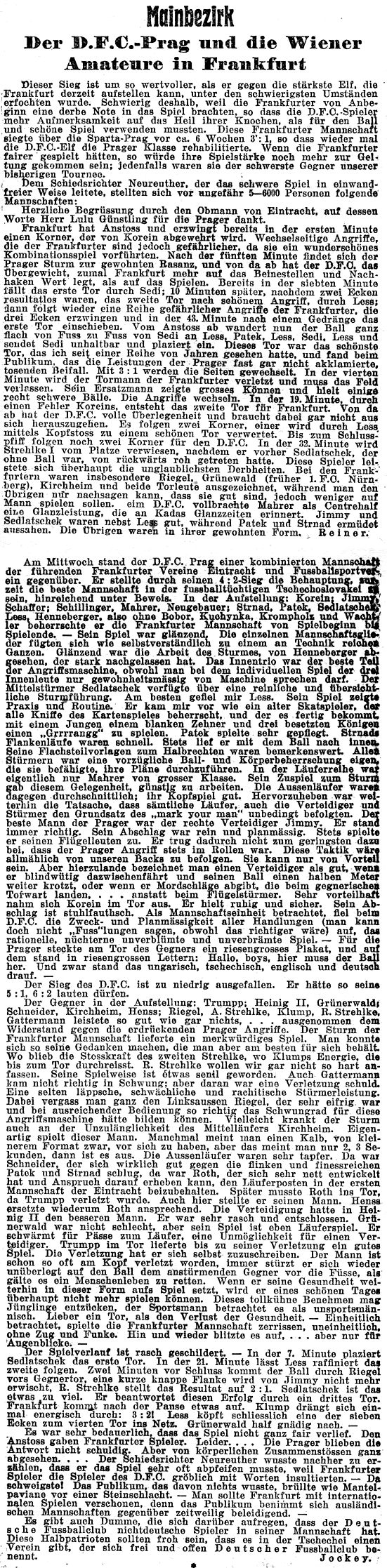 Deutscher Fußballklub Prag als Gast D.F.C. Prag schlägt am Mittwoch Eintracht-Sp.-Verein 4 : 2 (3 :1) Die Prager kamen mit sehr starker Mannschaft. Frankfurt hatte seine im Spiel gegen Sparta Prag so bewährte Elf der beiden Bornheimer Vereine gestellt. Kurz gesagt, unsere großen Hoffnungen auf dieses Spiel wurden enttäuscht. Wohl hatte man seine große Freude an dem großen Können der Prager, an denen wirklich kaum etwas auszusetzen war, aber an unserer Frankfurter Mannschaft! Auch sie hatte ihre guten Teile, aber einige Spieler versagten, weil sie es trotz aller Anstrengungen eben nicht besser konnten, und, was tausendmal schlimmer ist, mehrere Spieler wollten ganz einfach nicht, weil nicht alles nach ihrem Kopf ging. Das ist die sportliche Erziehung dieser Herren! Nun, geschehen ist geschehen, unser Urteil ist gefällt! Unter Leitung von Herrn Ludwig Neureuther lief das Spiel durchaus anständig. Herr Neureuther isl als sehr strenger Schiedsrichter bekannt, das mußte auch Klump erfahren, den er kurzerhand, aber berechtigt, vom Platz wies. D.F.C. Prag war stets leicht überlegen. Die Deutschböhmen gingen durch Patek in Führung, dem nach Fehler eines Verteidigers ein ruhiger, sicherer Torschuß aus kurzer Entfernung gelang. Bei einem fraglichen Strafstoß schlug Trump den Ball zu Boden, Patek zog ihn über den Kopf zur Mitte, die Verteidiger standen überrascht da und Leß drückte mühelos den Ball ein. Frankfurt griff dann etwas stärker an und R. Strehlke drückte eine Flanke Gattermanns das erste Tor für die Kombinierten ein. Nach der Pause stand das Spiel weiterhin meist im Zeichen der Prager, der Frankfurter Sturm zeigte keine Spur von Einheitlichkeit, trotzdem vier Mann schon seit Jahren nebeneinander spielen, ein zweites Tor wäre fast durch Unüberlegtheit vereitelt worden, doch gelang es Klump trotz. Behinderung durch seinen eigenen rechten Nebenmann aus vollkommen freier Stellung einen zweiten Treffer für Frankfurt zu erzielen. Ein Eigentor Grünerwalds bei dem Versuch, eine Ecke abzuköpfen, schloß den Reigen. Was bei der Prager Elf am besten gefiel, das war das exakte Sturmspiel, die feine Ballbehandlung, die absolute Fairneß und der ganz hervorragende Mittelläufer. In dem Frankfurter Sturm genügte Riegel allen Ansprüchen, nur wurde er von A. Strehlke nahezu geschnitten, ebensowenig verstand sich Klump mit R. Strehlke, und Gattermann war mehr als bequem und fast nie zur Stelle. Die Läuferreihe arbeitete eifrig bis zuletzt, aber der Mittelläufer konnte kaum gefallen, seine Vorlagen an den Sturm waren mangelhaft. Gut war bei den beiden Parteien die gesamte Hintermannschaft, Trump ereilte auch in diesem Spiel wieder das Geschick allzu großer Waghalsigkeit, bewußtlos schied er nach der Pause aus. Das Spiel hinterließ allseits einen bitteren Nachgeschmack. Nach der einen Seite schiebt man alle Schuld auf den ungenügenden Mittelläufer und glaubt sich dadurch einen Freibrief für Interesselosigkeit und Unlust geschaffen zu haben. Wo soll das noch hinaus? (aus dem 'Fußball', Ausgabe 33/1924 vom 18.08.1924)