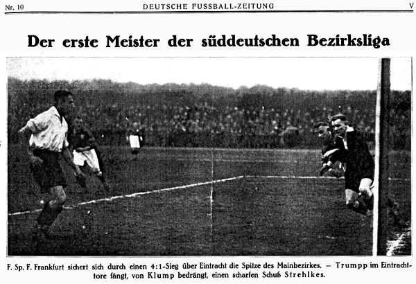 Die größte Besucherzahl hatte der Eintrachtplatz aufzuweisen. 5000 Zuschauer ist heutzutage für ein Bezirksligaspiel sehr viel, sind doch die Besucherzahlen im letzten Jahre allgemein zurückgegangen. Es ist diese Zahl um so bemerkenswerter, als dem Kampf der beiden Rivalen heute nicht mehr die Bedeutung des großen „Bornheimer Fußballderbys" zukommt wie in früheren Jahren, wo dieses Spiel der Höhepunkt der Ligakämpfe und fast stets entscheidend für den ersten Platz in der Tabelle war. Jetzt hat dieser Kampf durch den Niedergang der Eintracht seine große Bedeutung verloren. Und doch... immer noch liegt eine Spannung über diesem Spiel, das die Gemüter tagelang beschäftigt und doch stets anziehend wirkt, mehr wie jeder andere Kampf. Das zeigten die Zuschauermassen! Schön war der Kampf nur im ersten Teil, als man noch von Gleichwertigkeit der Parteien sprechen konnte. Trotz des Standes 3:1 bei der Pause! Die Chancen waren wohl gleich, aber deutlicher, schlimmer als je, zeigte sich die absolute Unfähigkeit des Eintrachtsturmes, Tore zu schießen, sonst hätte das Spiel am Schluß vielleicht 4:3 oder gar 4:4 gestanden. Es ist ein Jammer, es zuckt einem in den Beinen, wenn man zusehen muß, wie der Eintrachtsturm hilflos vor dem Kasten herumfackelt und, statt zu schießen, solange den Ball hin- und hergibt, bis er weggeschlagen wird. Schiedsrichter war Herr Gschwind, Stuttgart, der nicht Immer allzu scharf durchgriff, aber doch die Zügel gut in der Hand hatte. Im allgemeinen konnte man wohl mit ihm zufrieden sein. Nach ziemlich ausgeglichenem, schönem Kampf ging Eintracht durch einen Strafstoß Riegels in Führung, Sportverein glich durch eine einzigartig schöne Leistung Klumps aus. Ein Abseitstor Waldschmidts brachte Fußballsportverein in Führung, durch einen unglücklichen Sturz Grünerwalds, der dadurch Trump behinderte, konnte Klump das dritte Tor erzielen. Alle noch so schönen Angriffe der Eintracht waren im Strafraum zu Ende! Ein Foul Grünerwalds führte zu einem Elfmeter gegen Eintracht, den Trump mit dem Fuß abwehrte. Langsam erkämpfte sich Fußballsportverein die Oberhand und schließlich erzielte Gattermann nach schlecht abgewehrtem Schuß Waldschmidts den vierten Treffer. Klump riß den Sturm sehr gut und energisch mit vorwärts, gut wurde er von Reinhold Strehlke unterstützt, während die anderen Stürmer nicht immer befriedigten. Ganz ausgezeichnet spielte Völler, der seinen Flügel musterhaft abdeckte, Reitz gefiel durch ruhiges Zuspiel, Basthuysen konnte nicht befriedigen, da er zuviel defensiv wirkt, statt produktiv. Die Verteidigung war zeitweise unsicher, Koch hatte nur wenig zu tun. Im Eintrachtsturm gefiel Pfeiffer, der aber wieder zu wenig Verständnis fand, Schönfeld arbeitete mit größtem Eifer. Die Läuferreihe war schwach, besonders Roth, der dem Gegner mehr Bälle zuspielte als dem eigenen Sturm, die Verteidigung arbeitete zufriedenstellend, Grünerwald etwas zu hart. Trump hatte einige schwache Momente. (aus dem 'Fußball', Ausgabe 49/1924 vom 04.12.1924)