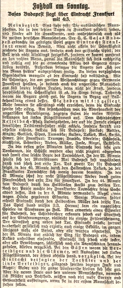 S.C. "Vasas"-Budapest - "Eintracht" Frankfurt 4:3 (3:1) Die "Eisen- und Metallarbeiter" haben hier gut gefallen. Die Mannschaft besteht aus sehr jungen, technisch vollendet durchgebildeten Spielern (Durchschnittsalter 21 Jahre), die ein kultiviertes, für das Auge sehr gefälliges Kombinationsspiel zeigten, womit sie dem Gastgeber selbstverständlich überlegen waren. Mit der Durchschlagskraft haperte es allerdings ein bißchen, was wohl auch daran gelegen haben mag, daß einmal Szentmiklossy, der bekannte Internationale, wegen einer Verletzung nicht mitspielte, und daß andermal die Mannschaft sich besonders nach Halbzeit eine gewisse Reserve auferlegte, die verständlich würde, wenn man das bevorstehende Spiel gegen den 1. F.C. Nürnberg berücksichtigte. Der vorzügliche Tormann konnte die drei Treffer der Frankfurter nicht verhindern. Die Verteidigung war sehr schlagsicher und verstand sich ausgezeichnet. Die Läuferreihe ließ nach Halbzeit etwas nach, war aber sonst fehlerfrei. Im Sturm überragte Takacz durch glänzende Ballbehandlung, Zuspiel und Bombenschuß. Es wurde verständlich, daß er beim Länderspiel dem Heiner drei Bälle ins Netz gejagt hat. Eintracht überraschte nach der angenehmen Seite. Die Mannschaft versteht ja allerdings seit Jahren, gegen auswärtige Gegner das sportliche Ansehen ihrer Vaterstadt gut zu wahren. So auch heute, wo sie trotz der Ersatzleute ein aufopferndes, recht erfolgreiches Spiel zeigte. Den zahlreichen verpaßten Torchancen nach hatte sie sogar ein Unentschieden verdient gehabt. Andrerseits ist der Sieg der Ungarn aber doch durch deren technische Überlegenheit gerechtfertigt. Trump, im Tor, hatte infolge Unwohlseins einen schwachen Tag und somit auch zwei Tore auf dem Gewissen, die wohl zu halten gewesen wären. In der Verteidigung gefiel besonders Eberlein durch sauberes Abspiel und gute Vorlagen. Auch Lemke stand nach anfänglicher Unsicherheit in jeder Weise seinen Mann. Schneider war trotz aller Anstrengungen schwach; er müßte unbedingt pausieren. Kirchheim und Schönfeld haben dagegen ihre Form wesentlich verbessert. Im Sturm arbeiten sich Imke und Riegel sehr schön ein. Müller technisch gut, war reichlich kopflos. Weber gefiel besser als in den letzten Spielen, während dem jungen Bechtold noch die Routine für solche Spiele fehlte. Die erste Halbzeit sah beide Seiten in wechselnden Angriffen. Nachdem Eintracht einige sichere Chancen ausgelassen hatte, kam Vasas in der 19. Minute zum ersten Torerfolg. Herr Rettelbach übersah wieder einmal eine krasse Abseitsstellung des Mittelstürmers, der auf Vorlage den Ball aufs Tor schoß, wo er Trump durch die Beine ins Netz glitt. 1:0. In der 30. Min. brach der Mittelstürmer dann in glänzender Weise durch und schob das Leder dem ungedeckt stehenden Takacz vor die Füße. Dieser schoß den Ball, seelenruhig placiert, zum zweiten Tore ein. Ein Freistoß gegen Vasas gelangte in der 33. Min. bereits zu Weber. Dieser rast die Linie entlang, steuerte aufs Tor zu und schoß sehr scharf. Der Torwächter konnte den schweren Ball nicht festhalten und mußte ihn ins Tor entgleiten sehen. 2:1. Nach prächtigem Flankenlauf gab der Rechtsaußen der Gäste kurz vor Halbzeit eine Flanke zur Mitte. Der angegriffene Takacz ließ den Ball passieren, und der freistehende Mittelstürmer schoß zum dritten Male an dem sich kaum rührenden Trump vorbei ein. Mehrere totsichere Torgelegenheiten wurden dann noch vorm Ungarntor vom unentschlossenen Eintrachtsturm vermasselt. Nach Wiederbeginn wurde das Spiel sehr interessant. Die Gäste hatten den linken Verteidiger und den Mittelstürmer ausgewechselt, konnten sich aber nicht mehr so richtig gegen die ehrgeizig kämpfenden Frankfurter durchsetzen, die bald Ihre erste Ecke erzielen. Der Ball kommt in der 5. Min. vors Tor, hier entsteht ein Gedränge, wobei ein Ungar Hand macht Den Elfmeterball verwandelte Riegel mit Bombenschuß unhaltbar. 3:2. Oleich darauf konnte der Gästetorwart einen wuchtigen 40-m-Schuß von Imke nur mit äußerster Mühe im Fallen zur zweiten Ecke abwehren. Der Ball gelangte zu Imke, dieser hob ihn über einige Köpfe zu Müller, der entschlossen einschob. 3:3. Eintracht hatte jetzt zahlreiche Torchancen, da die Gästeverteidigung zeitweilig nachließ, vermochte aber weiter nichts Zählbares zu erreichen Rettelbach leistet sich grobe Fehlentscheidungen. Endlich spielten sich der ungarische Innensturm nochmals durch. Takacz erhielt eine feine Vorlage und ließ einen gefährlichen Schuß aufs Tor los. Trump bekam wohl den Ball in die Finger, konnte ihn aber nicht festhalten. In der 35. Min. stand das Spiel 4:3 für Vasas, wobei es trotz Drängens der Frankfurter bis zum Schluß blieb. -Weka.- (aus 'Deutsche Fußball-Zeitung' vom 01.01.1925)