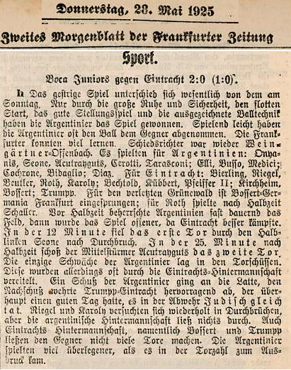 Frankfurter Echo Die Boca Juniores in Frankfurt a. M. Die Argentinier können Fußball spielen. Mehr braucht man eigentlich nicht zu sagen. Was die Argentinier am Mittwoch, 27. Mai 1925, von 7—8 1/2 Uhr zeigten, offenbarte alle Schönheiten eines Fußballspiels. Ich habe nie geglaubt, daß Fußball so schön sein kann. Das will sehr viel heißen. Man kann den Argentinier stundenlang zusehen, ohne zu ermüden. Die Bocas spielen kein hartnäckig und eigensinnig festgehaltenes Svstem. Sie spielen ein flaches Paßspiel, sie spielen bald ein schnelles halbhohes Spiel oder sie spielen hoch und wuchtig. Die Variationen ihres Spiels sind unerschöpflich. Der Ideenreichtum ihres Spiels ist verblüffend. Die Möglichkeit, durch Variationen zu entzücken, beruht auf dem Einzelkönnen der Spieler, auf ihrer körperlichen Kondition, auf ihrer Schnelligkeit, auf ihrer filigranen Technik. Man muß das Kopfspiel dieser Südländer gesehen haben, um zu begreifen, wie man mit dem Kopf spielen kann. Man muß die Flanken des kleinen Linksaußen gesehen haben, die besten Flanken der Welt, um zu begreifen, was eine Flanke ist. Das Spiel unserer besten deutschen Vereine ist steif, hölzern, [...] gegen das Spiel dieser Südamerikaner. Die Stuttgarter Kickers, Fürths Spielvereinigung spielen gewiß schön. Aber die Beweglichkeit und Harmonie ihres Spieles verhält sich zu dem der Bocas wie die Beweglichkeit einer Puppe zur Beweglichkeit eines lebhaften Kindes. Aber sie erreichen nicht die Gemessenheit des Nürnberger Spiels. Trotzdem ist das Spiel des 1. F.C. wie das mühsame Lösen einer schwierigen mathematischen Aufgabe gegen das Spiel der Argentinier. Man betone das Wort ,,Spiel", denn nirgends wird der Gedanke und Begriff „Spiel" besser und intensiver verkörpert wie im Spiel der Boca Juniores. Die Bocas schlugen ihren Gegner, die Eintracht Frankfurt, 2:0. Noch nie erschien mir eine Torzahl so unerheblich. Erheblich war die gute Leistung der Eintrachtelf, die unter Parrys Leitung viel gelernt hat und vor allem eine gute körperliche Kondition aufweist. Der beste Teil der Eintrachtelf war die Läuferreihe. Die drei jungen Leute mußten einen Sturm halten, wie wir ihn in Deutschland nicht haben. Die Außenläufer und der Mittelhalf waren die Besten auf dem Platz, wenn man ihre taktische Leistung zu dem Leistenmüssen in Beziehung setzt. Recht gut waren der Back Bossert (Germania), recht gut der Torwart. Im Sturm zeigte der linke Flügel ein gutes Spiel. ('Kicker' vom 09.06.1925)