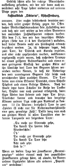| Die Eintracht gewann gegen Viktoria Aschaffenburg verdient 7:3. Dieses Resultat verrät die augenblickliche Stärke und die Schwäche der Riederwälder. Der Sturm ist äußerst gefährlich geworden, aber in der Hintermannschaft zeigen sich einige schwache Punkte. So ist Trumpp die Schuld bei einigen Toren der Aschaffenburger zu geben. Das Spiel war im Gegensatz zu dem in Offenbach schön und brachte gute Leistungen, auch das Publikum blieb sportlich einwandfrei. Die Mannschaften standen: Eintracht: Trumpp; Schütz, Kirchheim; Schönfeld, Kübert, Bäuerle; Döpfer, Dietrich, Schaller, Karoly. Weber. Aschaffenburg: Rettelbach, Münstermann, Hümpfner, Eckert, Brönner; Schäfer, Arnold, Annhäuser; Häcker, Albert; Zimmermann. Der Schiedsrichter Daxner, Sendlingen, befriedigte einigermaßen. Die gebotenen Leistungen waren gut. Es zeigt sich immer mehr, daß Dietrich die treibende Kraft im Eintrachtsturm ist, der ausgezeichnet zusammenspielt, Auch die Läuferreihe gefiel gut. Die Hintermannschaft zeigte einige schwache Momente. Bei Achaffenburg gefiel die Verteidigung und vor allem die linke Sturmseite. Das erste Tor für die Eintracht war ein berechtigter Elfmeter, den Dietrich verwandelte, dann glich der Gegner durch Münstermann aus. Wieder ging Eintracht durch Döpfer in Führung, dann stellt Münstermann aufs neue die Partie Remis. Kurz vor der Pause kann Weber den dritten Treffer für Eintracht erzielen. Schaller schießt das vierte Tor, ein Elfmeter wird vergeben, Döpfer erhöht die Zahl der Eintrachterfolge auf sechs, worauf wiederum Münstermann für Aschaffenburg erfolgreich sein kann. Ein Schuß Webers ergibt das siebente und letzte Tor. (aus dem 'Fußball' vom 01.12.1925)