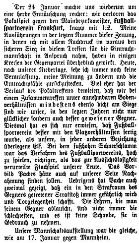 | Frankfurter Echo FuBballsportverein — Eintracht 2:1 Spiele der vorbezeichneten Vereine erwecken Frankfurts lebhaftes Interesse. „Man" [muss] dabei gewesen sein. Darin sind sich alle solidarisch. Es ist erstaunlich, wieviel Leute ungeheuer viel Zeit zu verschwenden wußten, um sich über dieses Spiel zu unterhalten. Man geht alsmal in ein Cafe, bald in dieses, bald in jenes. Sei es in welches auch immer man eintrat und sich niederließ. Das Ohr fing sofort Bruchstücke so gearteter Unterhaltung: ".... der Pache ... was, Pache ... Dietrich ... aber ... Läufer ... Brettville ... Brettville? ... kleiner Mann ... ganz nett ... Du Rindvieh ... Und die Läuferreihe... na, und Krieger... Ihr mit eu'erm Stürmchen ..." So flattertst ans Ohr. Das Auge sieht in zornige, sichessichere, bedenkliche Gesichter. Es schwirren auch tolle Gerüchte. Der Sportverein wolle mit seiner zweiten Garnitur antreten, weil ein paar Eintrachtler geschworen hätten, daß Hanau die Meisterschaft machen müsse. Deshalb trete man ein paar Bornheimer einfach zusammen. So redete man und dokumentierte durch diese Unterschiebung angeblicher, tatsächlich aber niemals gefallener Aeußerungen, wie wenig sportlichen Anstand man dem einen oder anderen Konkurrenten zutraute. Heissa juchhei... es lebe der alte Grundsatz: Tue möglichst viel und heimlich unrecht, und traue niemand. Das Wetter schien aber einen Strich durch die Rechnung zu machen. Es wechselte seine bekannte Laune recht häufig, wie der Lebemann seine alltäglichen Smokinghemden. Bald war es kalt, es schneite ... schöner Schnee lag überall ... man freute sich auf eine Fußballsymphonie in weiß, legte sich in der Fußballschublade des zerquälten Geistes schon die unpassendsten Vergleiche zu recht über die Wirksamkeit der blau-schwarzen Farben im Gegensatz zu der schneeigen Landschaft. Huch ... es wäre zu schön gewesen. Statt dessen fing es an warm zu werden. Ein etwas wärmlicher Wind.... von der Wärme einer Krankenstube, verirrte sich, durch irgend ein Hoch oder Tief veranlaßt, in unsere Gegend. Er fing an abzuwaschen. Und da es Sonntag wurde, ließ er seinen Zuber, seinen Schrubber und den restlichen Dreck liegen und fuhr in den Taunus. Da lag der Knatsch, der Matsch, der Dreck. Der Platz in Bornheim, von 7—8000 Personen, die keine Angst vor kalten oder nassen Füßen haben, wenn es gilt, ihr sonntäglich Gewerbe als Fußballzuschauer auzuüben, umrahmt, stellte sich als eine kleine arktische Landschaft aus der Vogelperspektive gesehen vor. So muß Amundsen die Gegend des von ihm vergeblich erstrebten Nordpols von seiner Flugzeugkajüte aus gesehen haben, wie die Begeisterungsfähigen und der Nässe Trotzenden den Sportplatz. Hier ein kleines schneebedecktes Gebirge ... eine Eisscholle ... eine lange, lange Strecke festes Eis, zwischendurch tiefdunkelblinkendes Gewässer ... unheimlich fast. Na, viel Vergnügen, denk ich mir, als die zweiundzwanzig Spieler in den fröhlichen Matsch stampfen und Wasserwogen um sich verspritzen. Noch bestand eine kleine Hoffnung, daß der Verstand eines Schiedsrichters dem zu erwartenden grausamen Schwimm- und Schlammschlitterwettbewerb Abbruch tue. Die Hoffnung wuchs, als Kratzenberger die beiden Mannschaften zusammenrief und auf sie einredete. Nein, es wurde gespielt. Die achttausend Menschen übten einen hypnotischen Zwang aus. Man wollte sie nicht toben und schreien und unzufrieden nach Hause sehen und sehen. Das Spiel im Dreck begann. Es begann mit einigen leichten, zärtlich kombinierten Eintrachtangriffen, wie die Anfangstakte aus irgend einem italienischen Musikstück. Aber es kam Dreck in die Instrumente. Die Töne verklangen zu rasch. Auch fuhr der unmusikalische Gegner dazwischen. Fast schien der Eintracht zu Anfang ein Erfolg zu blühen. Aber was soll bei diesem Wetter blühen? Die Angriffe endeten in Dreckspritzern, in laut klatschenden Stürzen der Spieler, in ein kleines Eismeer. Durchnäßt entwanden sie sich der schlammigen Nässe, schüttelten sich wie gebadete Katzen und gingen an ihre mühselige Arbeit. (Wollt ihr, die ihr dies mit ansaht, das Berufsspielertum weiter verbieten?) Der leichte Belagerungsgürtel der Eintracht um das Sportvereinstor wurde unversehens durch einige wuchtige Angriffe des Gegners gesprengt. Paches prachtvolle und für den Boden denkbar geeignete Vorlagen, jagten die Spieler übers Feld, den lange und stets zögernden Waldschmidt sogar, den kleinen Krebs, der wieder das Flanken vergaß und auf eigene Faust das Tor suchte, ohne es mit seinem unplazierten und unüberlegten Schuß finden zu können. Auch das Innentrio tut sein Uebriges, obwohl hier der famose Norweger Brettville allein steht, so gut wie allein, da sein Nebenmann Fischer von keiner auch nur der leisteten Fußballkenntnis angekränkelt ist und Gattermann den Posten R. Strehlkes nicht auszufüllen vermag. Blau-schwarz drückt stärker auf das Eintrachttor. Die kleinen hübschen, aber ergebnislosen Kombinationsangriffe sind verschwunden. Pache steht in der Feldmitte und dirigiert seine Angriffstruppen. Sie bekommen viel Futter. Aber die Eintrachtverteidiger werfen sich dazwischen. Der kleine During macht ein paar judische (bitte nicht jüdische... kommt vielmehr von Judisch) Paraden. All dies versagt den Erfolg. Noch mehr der enorme Dreck, in dem die Spieler knöcheltief herumsteigen und keinen festen Grund finden, um den noch so gut liegenden Ball abschießen zu können. Das Spielfeld sieht zeitweise aus wie ein, von einer Seeschlacht, betobtes Meer. Wenn ein Mann fällt, spritzt die kalte Gischt bis zum Himmel, mühsames Schwimmen rettet den jeweils Gestürzten vom Ertrinkungstode. (Das ist doch ein bißchen übertrieben, was?) In den Kampf zwischen Naturgewalten und menschlicher Energie und Sinnlosigkeit platzt das erste Tor für die Blau-schwarzen, die Herzen der Anhänger heftig erschütternd. Pache gab einen seiner Strafstöße ab, lenkte ihn vor das Tor, wo es von Wassermännern (bitte nicht medizinisch) 