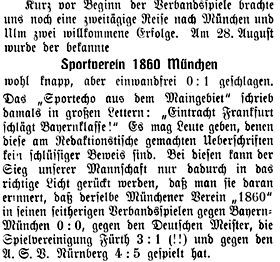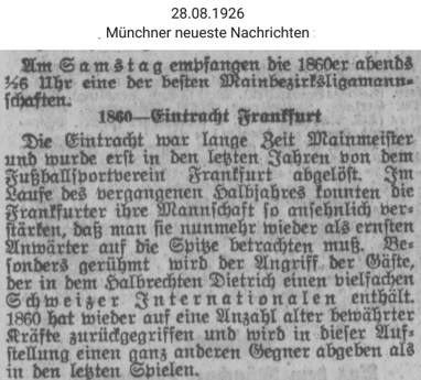 Huber Schiedsrichter: Meßberger (Augsburg). Auffallend schwacher Besuch: 1500-2000. Die Punktspiele stehen vor der Tür. Gewöhnliche Privatspiele ziehen jetzt schon gar nicht mehr. Münchens Publikum will was Besonderes sehen. (Am kommenden Samstag werden die 60er mit ihrem ersten Ligaspiel gegen Bayern den ersehnten Massenbesuch haben.) Die Frankfurter Eintrachtleute gefielen nicht schlecht, sie sind heute mindestens so stark wie der F.Sp.V. Namentlich im Angriff bemerkte man guten Aufbau, aber auch Deckung und Torwart waren auf dem Posten, ganz vorzüglich der linke Flügelläufer. 1860 war ein Gegner, der weitaus die meisten Torchancen herausarbeitete, aber im entscheidenden Augenblick versagte. Dem neu zusammengestellten Sturm fehlt noch die schnelle Gedankenarbeit, ohne die die besten Aktionen nicht schußreif werden. Das einzige Tor fiel in der Mitte der ersten Halbzeit: Linksaußen hatte sich vorgearbeitet und in weitem Bogen zum Rechtsaußen geflankt, niemand dachte an eine unmittelbare Gefahr, aber kaum war der angreifende Vogel umgangen, da saß auch schon ein Schrägschuß im Münchener Tor. Kob, dem die Aussicht etwas verstellt war, war vollkommen überrascht. Bis zur Pause gab 60 den Ton an und ging mit großen Aussichten in die Pause. Aber vergeblich mühten sie sich, die ganze zweite Halbzeit um den Ausgleich. So blieb es bei einem mageren Ergebnis ejnes mageren Spiels. Man hat noch kein klares Bild von 1860, aber es ist absolut falsch, zu glauben, die 60er würden in der kommenden Saison keine besondere Rolle spielen. Bis jetzt weiß man noch nicht, wer am Samstag gewinnt. Bayern oder 1860? Das Ergebnis ist eine ganz offene Frage. (aus dem 'Fußball' vom 31.08.1926)
