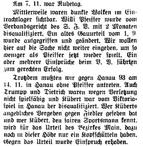 Rund um Frankfurt 1. Hanauer F.C. 93 — Eintracht Frankfurt 1:1. Das Vorspiel, welches Hanau 93 in Frankfurt in der zweiten Hälfte durch eifrigeres und besseres Spiel der Eintrachtler 3:1 verlor, konnte man als Maßstab nicht nehmen, denn einesteils war Hanau seinerzeit durch Hilperts und Karls Fehlen benachteiligt und andernteils fehlt heute bei Eintracht Pfeifer, Dietrich und Kübert, auch Trumpp wird nicht von der Partie sein, dürfte aber von Judisch vollkommen ersetzt worden sein. Die Chancen hatten eigentlich nun für Hanau 93 gesprochen, aber es kam anders, und Eintracht konnte dank eifrigem Spiel und eines für solche Spieler noch nicht qualifizierten Schiedsrichters, einen für sie wertvollen Punkt mit nach Hause nehmen. Gegen Ende der ersten Hälfte taut Hanau etwas auf. Der Erfolg bleibt dann auch eine Minute vor der Pause nicht aus. Karl hat sich freigespielt, schiebt zum gutstehenden Schäfer, welcher an Schnorr weitergibt, der mit gutem Schuß das erste Tor einschießt, welches aber Judisch bei nicht glattem Boden sicher gehalten hätte. Jubel im Hanauer Lager, welcher anhält, bis beide Mannschaften das Feld verlassen haben. Gleich nach Wiederanfang gibt der Schiedsrichter einen zweifelhaften Strafstoß an der 16-Meter-Linie, welcher von Schaller schön getreten, direkt verwandelt wird. Fifi. (aus dem 'Fußball' vom 16.11.1926)