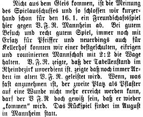 Frankfurter Echo Eintracht gegen VfR. Mannheim 2:2 Wenn mir die siebenmonatliche Beschäftigung auf Klasse Untersekunda die „Jungfrau von Orleans" nicht so sehr vermiesst hätte, wurde ich mit dem pompösen Zitat beginnen: „Die Waffen ruhen, des Krieges Stürme schweigen..." So begnüge ich mich handereibend mit der Feststellung, daß die Verbandsspiele ein seliges Ende gefunden haben. (Es könnte Leute geben, welche den ersten Satz falsch verstehen. Man lasse seiner Phantasie den allerfreisten Spielfreilauf.) Die Vereine tun etwas für ihre Landwirtschaft, denn sie lassen ihre Spieler, die auf ihrem eigenen oder fremden Miste gewachsen sind, in Privatspielen etwas lernen. Im fröhlichen Plätschern des lauen Privatspielgewässers wird man des Fußballs erst wieder froh. Man sieht, daß etwas dahinter steckt. Man merkt, daß er nicht nur dazu da ist, um die zeitweise grotesk geratenen Instinkte sonntagslangweiliger Typen zu entfesseln und zu befriedigen. Diese Feststellung ist sehr wertvoll, denn die so festgestellte Erscheinung — nicht die Instinkte, sondern das "Etwas-Dahintersteckende" — läßt einem letzten Endes an der sittlichen Kraft des Fußballsportes nicht verzweifeln. Die Eintracht begann die Privatspiele mit einem ausgezeichneten Gegner. Das ist sie schließlich ihrer Privatspiel-Traditiion schuldig. Zudem ist der VfR. Mannheim allhierorts ein gern gesehener Gast. Er entschädigte die Zuschauer für ihr Kommen meiner Ansicht nach mehr als reichlich. Für Mannheims Spiel habe ich immer ein gewisses Faible gehabt. Es ist im Laufe der Zeit reifer geworden. Die Kambination war ausgezeichnet. Man bekommt nicht jeden Sonntag solche Leckerbissen auf der Fußballschüssel serviert. Originelles und phantasievolles Zusammenspiel sah man, überraschende und die Schwierigkeit einer jeden Situation lösende Pässe vom Stürmer zum Läufer, vom Läufer zum Verteidiger und umgekehrt. Dabei geschah dies alles nicht um des Reizes willen, den solche Stückchen ausüben, sondern auf der gesunden Grundlage des Zuspiels auf den freien Raum und den freistehenden Mann. Nahm zum Beispiel irgend ein Stürmer den Ball auf und lief dem gegnerischen Tor zu, bedrängt von einem Läufer und von einem Back bedroht, dann gab er den mühsamen Versuch des Durchbrechens entschlossen auf, er vermied es auch, den anderen Stürmern zuzuspielen, weil diese wohlgedeckt waren, kühn und entschlossen spielte er seinen Ball zu irgend einem freistehenden Läufer. Und dieser Läufer war auf den Ball gefaßt, erwartete ihn zu jeder Minute und war sich über die Art seiner Verwendung bereits klar. Auch in den Zeiten höchster Bedrängnis verschmähte es ein Verteidiger nicht, im Strafraum sogar an den Partner abzuspielen, weil dieser freiere Bewegungsmöglichkeit hatte. Daneben gab es aber auch die energischen, harten, halbhoch und steil durchgeführten Vorlagen an die Außenstürmer. Auffallend und vorteilhaft war es, daß sie von den auf diese Art vortrefflich zuspielenden Backs fast ausschließlich bedacht wurden. Im Augenblick des Ballabschlags standen sie daher meist noch frei, da sich der Innensturm kurz zuvor mit der ganzen Hintermannschaft herumgeschlagen und diese auf sich konzentriert hatte. Man merkte eben sachgemäßes Training, insbesondere auch an der körperlichen Durchbildung der Spieler. Trotz dieser gutdurchdachten Spielweise gabs keine Ueberzärtelung, sondern kräftiges Spiel. Im einzelnen war der Sturm im Feld sehr gut, im Zusammenwirken manchmal wie die Hand eines berühmten und tastensicheren Pianisten, deren fünf Finger das Leben in ihrem Nachbarn spüren. Grünauer glänzte durch gute und energische Flankenläufe und gute Flanken. Der Rechtsaußen war etwas schwächer. Im Innensturm verspricht Bleß ein ebenso guter Stürmer zu werden, wie er ein Läufer war. Engelhardt II hat, glaub ich, längere Zeit nicht mitgewirkt. Sein technisches Repertoire ist außergewöhnlich reichhaltig und seine Beteiligung an dieser Stürmerreihe zu deren Vorteil. Fleischmann als Mittelstürmer schoß beide Tore. Das Schußvermögen der Stürmer war im übrigen recht schwach und diese Schwäche der Hauptfehler der Mannschaft. Die Läuferreihe gut; drei sehr bekannte Spieler. Sie war dem Eintrachtsturm an Körperkraft reichlich überlegen. Ihr Spiel war gut, Deschner war wohl der schwächste. Die Verteidigung war sehr sicher in der Abwehr. Den Torwart Betsch muß nach anfänglich guten Leistungen die Nervosität gepackt haben, denn er beging einige schwere Fehler. Die Eintracht war technisch und im Felde keineswegs viel schlechter. Ihr Feldspiel und ihre Kombination inkliniert zum Schematischen und Mechanischen. Die Vorlagen und Pässe kommen nicht mit der Exaktheit, die Mannheims Vorlagen und Pässe zeigten. Das Zuspiel auf den freistehenden Mann und auf den freien Raum ist nicht gut genug durchgebildet. Auch die Durchführung der Vorlagen ist nicht exakt genug. Das mag an der Ballbehandlung und -beherrschung liegen. Hierin waren die Mannheimer überlegen. Schließlich konnten die Eintrachtspieler mit einigen Ausnahmen an das Stellungsspiel der Mannheimer nicht heran. Diese Fehler lassen sich nur durch die Arbeit eines Trainers ausmerzen, der Gelegenheit hat, die Mannschaft zu studieren und zu beobachten und mit Anweisungen zu versehen. Der Fußballspieler braucht seine Gebrauchsanweisung ebenso wie ein Anti-Grippepräparat. Wesentliche Schwächen in der Mannschaft beeinträchtigten die oft naheliegende Siegesmöglichkeit (Ein Sieg wäre unverdient gewesen.) Die Flügelstürmer waren sehr schwach besetzt. Man sollte Kellerhof und Döpfer auf ihren Posten stehen lassen und, wenn das Eintrachtherz schon an Kaufmann hängt, diesen sehr eifrigen Spieler in den Innensturm nehmen. Vor allen Dingen würde Dietrich als Mittelstürmer noch mehr leisten. Das „noch" steht mit Absicht da, denn der Schweizer ist für den Eintrachtsturm eine Notwendigkeit. Es liegt eben an den Nebenleuten, wenn sie seine Vorlagen nicht a