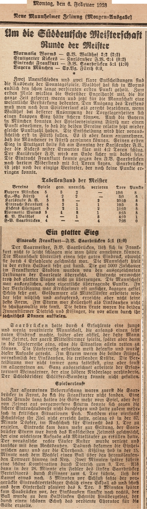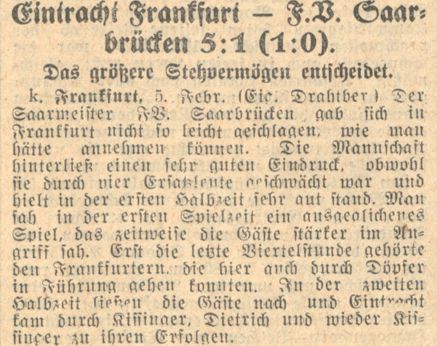 Eintracht Frankfurt 5, F. V. Saarbrücken 1 Der Fußballverein Saarbrücken wurde als willkommener Vertreter des Saarlandes von der Frankfurter Eintracht mit Blumen und Ansprache empfangen. Trotz der sehr deutlichen Niederlage machten die Gäste keinen schlechten Eindruck, wenngleich offensichtliche Schwächen klar erkennen ließen, daß der Saarbrückener FV. vorläufig nicht zur ersten süddeutschen Klasse gerechnet werden darf. Man darf annehmen, daß die Gäste auch unter Verwendung der heute fehlenden Spieler Dahlheimer, Siegling, Gelf, Welcker, nicht wesentlich stärker sind, als sie sich heute einer nicht allzu zahlreichen Zuschauerschaft im Frankfurter Stadion zeigten. Immerhin war die Notwendigkeit, Ersatzleute einstellen zu müssen, insofern von Bedeutung, als Zeimet anfangs Mittelstürmer spielte und so seiner Partei nicht den Zusammenhalt geben konnte, wie seine Kameraden dies von ihm als Mittelläufer gewohnt sind. Die Saarleute brachten in Weingärtner einen ganz vorzüglichen Torhüter mit, der nur anfangs gegen einige hohe Bälle etwas unsicher war, dann aber den äußeret zahlreichen und fast stets recht gefährlichen Schüssen des Eintrachtsturmes mit erstaunlicher Sicherheit zu begegnen wußte. Nicht ganz sicher zeigte sich die Verteidigung, in der Lesch durch leichte Verletzung etwas behindert schien. Immerhin war sie noch besser, als die Läuferreihe, die nach der Pause den Frankfurter Sturm nicht mehr zu halten wußte. Eine löbliche Ausnahme machte der linke Läufer Ruster, der durch überlegtes Stellungsspiel dem Frankfurter Rechtsaußen viele Bälle wegfangen konnte. Als Zeimet durch Platzwechsel der Läuferreihe den gelohnten Halt geben wollte, war das Schicksal der Gäste, die sich bis zur Pause leidlich gehalten hatten, bereits besiegelt. Durchaus nicht schlecht, wenn auch wenig erfolgreich, arbeitete der Sturm, der vor allem in Benzmüller und Comes zwei aggressive Leute besitzt. Sehr regsam betätigte sich auch der Halblinke W. Schmidt, dem schließlich auch das verdiente Ehrentor gelang, wenn auch die Hintermannschaft der Eintracht keinen allzu ernsthaften Versuch gemacht hatte, es zu verhindern. W. Schmidt, Zeimet und Comes zeigten übrigens auch einige sehr energische Schüsse. Was bei der Angriffsreihe besonders lobenswert erscheint, ist die wirksame Mithilfe beider Halbstürmer in der Hintermannschaft. Im allgemeinen spielte die Mannschaft nicht hart genug auf Sieg. Der letzte Rest von Hingabe war nicht vorhanden. Auch Eintracht lieferte keine Kampfpartie. Anscheinend fühlte sie sich von Anfang an des Sieges gewiß. Man darf aber nicht übersehen, daß dieser Sieg erst nach der Pause zum zahlenmäßigen Ausdruck kam. Vor der Pause wollte es mit den besten Gelegenheiten nicht recht klappen. Zahlreiche Torchancen wurden ausgelassen, verschossen oder abgewehrt. Drei Pfostenschüsse lassen auch eine Kleinigkeit Pech von Bedeutung erscheinen. Volle 36 Minuten waren jedenfalls nötig, bis eine Kombination Goldammer—Kellerhoff—Schaller—Döpfer den ersten Treffer zeitigte. Von da an kam allerdings die Frankfurter Technik und das überlegene Zusammenspiel vollauf zur Wirkung. Kissinger machte das zweite, Dietrich das dritte, und wiederum Kissinger das vierte Tor. Alles waren die Früchte glänzender Kombinationshandlungen. Zum Schluß verwandelte noch der Verteidiger Schütz einen von Kellerhoff getretenen Eckball. Trotz des mehr als hinreichenden Erfolges muß aber daran erinnert werden, daß das Zusammenspiel des Innensturmes meistens zu engmaschig war. Bei einer besseren Abwehr auf der Gegenseite wäre die Taktik der Eintracht bestimmt nicht zu so vielen Toren gekommen. Immerhin darf anerkannt werden daß außergewöhnlich viel und gut geschossen wurde und daß die gesamte Eintrachtelf ein für das Auge sehr gefälliges Spiel lieferte. Nur Kirchheim und Müller waren schwach, auch Trumpp schien nicht auf der Höhe früherer Tage. Man darf jedoch annehmen, daß die Eintracht bei ernsteren Gegnern auch wieder größere Kraftanstrengungen machen wird, als sie ihr heute abverlangt wurden. Herr Alois Schliefer vom FV. Bamberg war kein schlechter Spielleiter. Jedenfalls „schlief er" während des Spieles nachweislich nicht und entpuppte sich als sehr brauchbarer Spielleiter. Ludwig Isenburger. (aus dem 'Kicker' vom 07.02.1928)