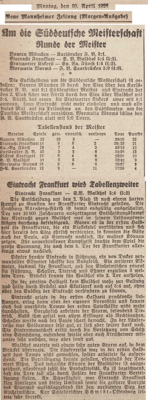 Eintracht Frankfurt 5, Sp.V. Waldhof 4 Es war ein äußerst spannendes, zum Schlusse sogar aufregendes Treffen, das der Frankfurter Eintracht vor etwa 12.000 Stadionbesuchern den zweiten Tabellenplatz und damit die Teilnahmeberechtigung an den Kämpfen um die Deutsche Meisterschaft brachte. Es war ein Kampf von einer Härte, wie man sie selten sieht. Auch die Siegesaussichten der beiden Parteien lösten sich, wenigstens in der Zeit nach der Pause, oft genug blitzschnell ab. Der Gesamteindruck der Veranstaltung war insofern schon recht erfreulich, als man auf keiner Seite einen sogenannten „schwachen Punkt" ermitteln konnte. Beide Mannschaften zeigten sich als gut zusammengeschweißtes Ganzes. Natürlich gab es auf beiden Seiten bessere und schlechtere, richtiger gesagt, weniger gute Mannschaftsteile, aber im allgemeinen durfte man mit den Leistungen jedes einzelnen Spielers zufrieden sein. Eintracht beherrschte bis zur Pause die Lage weniger deutlich als sicher. Die bekannte Schnelligkeit der Mannheimer wurde von Frankfurter Seite noch überboten, so daß sich die Gegenpartei mit raffiniertem Stellungsspiel zu helfen suchte, einer Taktik, in der sie allerdings Meister war. Bis zur Pause fielen die Tore tatsächlich — um einen deplazierten Ausdruck zu gebrauchen — in regelmäßigen Abständen. Döpfer und Schaller fabrizierten den ersten Treffer in wunderbarer Weise. Ihm folgte für jede Partei ein Elfmeter wegen Handspielens. Beide wurden verwandelt. Wieder leitete eine sehr gute Leistung Döpfers den dritten Eintrachttreffer ein, den Schaller ins Tor beförderte, Dietrich verwandelte die zweite Eintrachtecke und Ehmer köpfte einen Strafstoß Küberts ins Netz. Unmittelbar vor der Pause holte Brückl durch einen Fehler Kirchheims ein Tor für Mannheim auf, so daß bei 5:2 Seitenwechsel erfolgte. Kurz vor der Pause hatte der Eintrachtverteidiger Schütz das Nasenbein gebrochen, spielte zwar später mit einem Notverbande weiter, aber seine Mannschaft schien doch nicht mehr das notwendige Vertrauen zu seiner Zuverlässigkeit zu haben, so daß in den folgenden 45 Minuten doch nicht mehr alles so klappte, wie es bis zur Pause der Fall war. Vor allem aber hatten sich die Gegner inzwischen aus ihrer anfänglichen Befangenheit herausgefunden und bewiesen bis zum Spielende, daß sie trotz ihres schlechten Tabellenstandes in ihrer derzeitigen Form zu den besten Mannschaften des deutschen Südens zu rechnen sind. Ihre Kombination ist genau, ihr Stellungsspiel äußerst nutzbringend. Leider hatte der Sturm vor der Pause ziemlich wenig Glück mit teilweise recht scharfen Schüssen. Mannheims Torhüter wehrte glänzend ab, in der Hintermannschaft fiel das sichere Spiel des Mittelläufers angenehm auf, im Sturme führte Brückl zielbewußt, neben ihm war wohl Decker der beste Angriffsmann. Die Einzelkritik der Eintrachtleute hat ebenfalls mit einem Lobe des Torwächters zu beginnen. Er warf sich der Gefahr entgegen, gerade als es um den Eintrachtsieg besonders bange aussah, Schütz, der gesunde, wird dem anwesenden Herrn Otto Nerz sicherlich gut gefallen haben. Aber auch der Mann mit dem Notverband tat noch vollauf seine Schuldigkeit. Bemerkenswert arbeitete der Eintrachtsturm. Die rechte Seite zeigte Produktivität, die linke Technik. Schaller und Döpfer harmonierten besser zusammen, als Dietrich und Kissinger. Dieser erwies sich als tadelloser Linksaußen, aber seinem Nebenmanne, so tüchtig er in der Einleitung von Handlungen ist, ist nun einmal die Fähigkeit nicht gegeben, sich den Intentionen der anderen schnell genug anzupassen. So haperte es gelegentlich auf der linken Angriffsseite. Bemerkenswert bleibt, daß Eintracht nach der Pause keine Tore mehr zu erzielen vermochte, während Mannheim durch einen Kopfball Brückls und einen placierten Schuß Skutlareks dem Ausgleich greifbar nahe rückte. Schließlich brachte Eintracht doch noch ihr 5:4 unter Dach und Fach. Sie ist also Tabellenzweite und wird in den weiteren Spielen um die „Deutsche" gewißlich keine schlechte Figur machen. Die Spielleitung des Herrn Karl Schmitt vom FV. Offenburg verdient besondere Erwähnung. Er demonstrierte deutlich den Unterschied zwischen einem peinlich genauen und einem kleinlichen Schiedsrichter. Herr Schmitt hat in diesem für ihn sehr schwierigen Kampfe tadellos bestanden. Wenn es trotzdem einige Protestrufe gab, dann trifft die Meinung der Zuschauerschaft neben das Ziel. Uebrigens, was will die Divergenz in den Auffassungen des Publikums und des Spielleiters besagen? Das Sinnen und Trachten der Zuschauer ist meistens auf Torgewinn oder Torverhütung eingestellt, nur der Spielleiter konzentriert sich allein auf die Einhaltung der Spielregeln. Können da Meinungsverschiedenheiten ausbleiben? Ludwig Isenburger. (aus dem 'Kicker' vom 01.05.1928)
