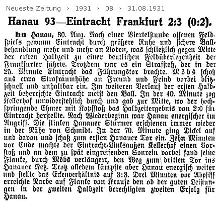 Hanauer Sport Hanau FC. 1893 — Eintracht Frankfurt 2:3. Eine Augenweide für jeden, der diesem Kampfe beigewohnt hat, ein Spiel reichhaltiger Momente, in fairer Form durchgeführt und aufs korrekteste von Kotz-Göppingen geleitet. Die erste Kampfhälfte gehörte dem Süddeutschen Meister, die zweite den Hanauern. Gleich zu Beginn merkte man, daß die Frankfurter nicht gesonnen waren, die Hanauer 93er aufkommen zu lassen. Die Eintrachtleute waren schneller als ihre Gegner, sie spielten mit mehr Verstand, stoppten alles was vor die Füße kam, und was die Hauptsache war, ihr Täuschungsvermögen war überragend. Man merkte jedem Einzelnen an, daß hier eine gute Schule am Werke war. Aber eines fehlt auch dem Frankfurter Sturm, wenigstens bei diesem Spiele, die Fähigkeit, den Ball aus der Luft und sicher zu schießen. Die Stürmer legten sich ihre Bälle schnell und sicher zurecht, aber selbst der kurze Moment des Stoppens genügte den gewandten Deckungsleuten, für die man Schramm und Laber ansehen durfte. Als dann Hanau in der zweiten Hälfte die anfänglich lahme Laune mit energiereichen und elanvollen Angriffen vertauschte, war der Meister in eine ziemlich schwierige Situation geraten. Es sah nach dem 2:1 anders aus, bis dann ein drittes Eintrachttor kam. Immerhin darf man den Hanauern sagen, daß sie erst besser wurden, als es leider zu spät war. Und was weiter nicht imponierte, war die Unruhe und Unüberlegung, mit der die Hanauer ihre Aufgabe zu lösen suchten, die in scharfem Gegensatz zu des Gegners Spiel standen. Daß die bessere Mannschaft gewonnen hat, unterliegt keinem Zweifel, Leute wie Schütz, Dietrich, Möbs, Ehmer usw. sind nicht so leicht tot zu kriegen, und auch ein Gegner großen Formats muß schon sein ganzes Spiel-Repertoire herunterleiern, wenn er diese Mannschaft überwinden will. Die schneidige Eröffnung der zweiten Hälfte, das wahnsinnige Tempo, die ruhige, auch sonst gewohnte Kombination gingen gegen Schluß wieder unter. Allgemein darf man über Hanau sagen, daß trotz vieler Wenn und Aber auch ihr Spiel begeisterte, und das Schlechte der ersten Hälfte gerne vergessen wurde, als in der Fortsetzung reicher Anlaß zu Lob und Dank vorhanden war. Es reichte leider nicht ganz, aber auch Eintracht war froh, unbesiegt davon gekommen zu sein. Kaba. (aus dem 'Kicker' vom 01.09.1931)