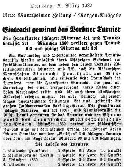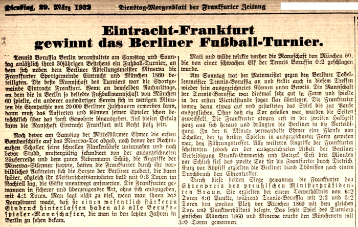 Dazu verschießt Ehmer zwei günstige Sachen. So wird es * Der Tennisborussen - Mittelstürmer prallt mit Schütz zusammen, geht hinkend vom Feld. Für ihn Ersatzmann. Nach einem Angriff des rechten Eintrachtflügels stellen vier Frankfurter vorm Berliner Tor. Der Halbrechte Möbs gibt selbstlos zu Ehmer, der trotz scharfer Deckung aus dem Knäuel flach nah einschießt. 1:0 Eintracht. * Der Frankfurter Ersatz-Linksaußen, der lange Gorch, macht einige Fehler, teils liefert er aber auch ausgezeichnete Vorlagen. Jedenfalls hat er Talent. Tennis-Borussia läßt jetzt gegen die erste Halbzeit sehr nach. Mit Elan kann man eben nicht 90 Minuten lang spielen. Eintracht liegt stark überlegen vorm Berliner Tor. Beide Frankfurter Backs stehen über der Mittellinie. Wenn zwei sich so gut verstehen und so gut aufeinander eingespielt sind wie Stubb und Schütz, mögen sie es riskieren. Selbst der Mittelläufer Leiß beteiligt sich am Schießen aufs violette Tor. Der kleine schwarzbuschlige Kerl haut von 35 m eine Bombe aufs Tor, die Patzek nur mit Mühe hält. * Eintracht schnürt das Tennis-Borussen-Tor völlig ein. Der Verteidiger Schütz steht 10 m über der Mittellinie im feindlichen Felde, der Eintracht-Tormann Schmitt verweilt geruhsam an der 16-m-Linie. Aber gerade diese enge Blockade bringt keine Tore. Denn sie konzentriert die ganze Tennis-Borussen-Elf zur Abwehr in engen Raum. Solche Einschnürung kann sogar gefährlich sein. Denn die wartenden Außenstürmer können dabei überraschend durchbrennen. Was dem Berliner Linksaußen Pahlke auch beinahe mit Erfolg gelingt. Eintracht schnürt und schnürt. Zuviel nach innen, wo alles blockiert und gedeckt ist und keine Schußbahn frei. Eintrachts taktischer Fehler, daß es da nicht vor allem die Flügel beschäftigte, um die Abwehr auseinanderzureißen. In solchem Fall müssen die Außenstürmer versuchen, selbst Tore zu machen. Eintracht ist dank seiner Läuferreihe und der Sturmkombination turmhoch überlegen. Endlich befördert Ehmer den Ball von 4 m seitlich ins Tor. 2 :0 Eintracht. * Einseitiges Katze- und Maus-Spiel. Die Maus ist Tennis-Borussia. 6:0 für Eintracht müßte das Spiel lauten. Aber da überlistet die Maus noch die Katze. Der unverzagte Mittelstürmer der Berliner bricht durch — unbekümmert um die berühmten Backs — und schießt ein. 2 :1 Eintracht. Das war eine Sekunde vor Schluß. Ende 2:1 Eintracht. [...] Die Eintracht hat mit 4:0 Punkten und 6:2 Toren den Ministerpräsidenten-Preis gewonnen. [...] (aus dem 'Fußball' vom 29.03.1932)