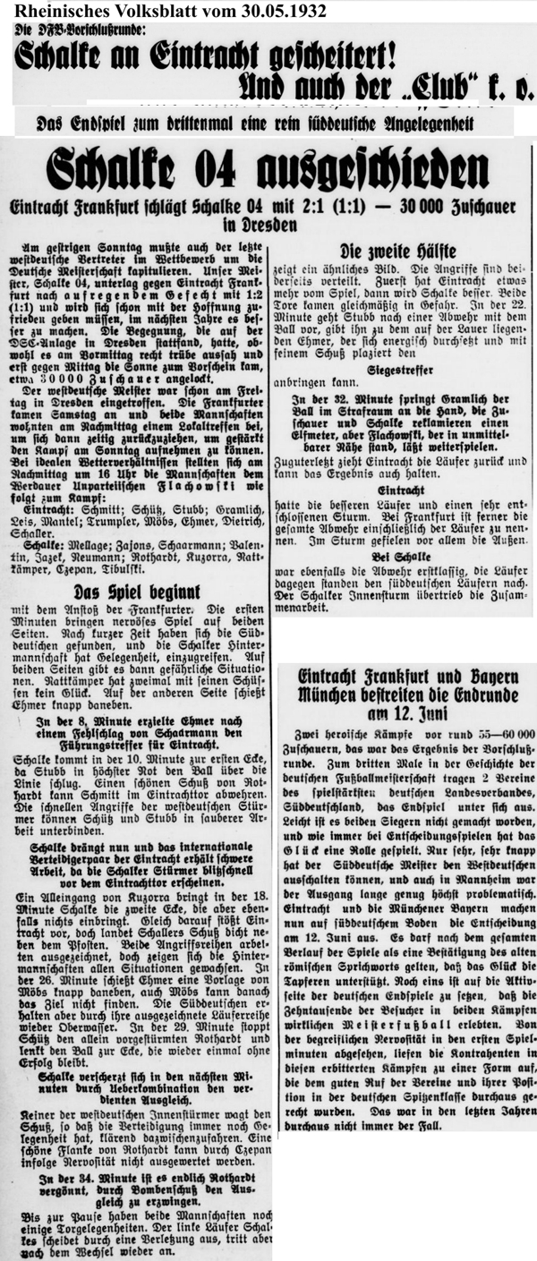 Eintracht ist erneut mit 2:1 in Führung gegangen! Herzlicher Beifall belohnt diese wunderbare Leistung! Vorübergehend gewinnt nun zwar Schalke wieder an Boden. Schütz und Stubb retten mehrfach in letzter Sekunde. Aber die Widerstandskraft der Schalker scheint doch etwas gebrochen. Eine Viertelstunde vor Abpfiff ereignete sich dann jene Szene vor dem süddeutschen Tore, bei welcher der Schiedsrichter ein Handspiel eines Frankfurters übersehen hat, was ein häßliches Pfeifkonzert auslöst. Schalkes Angriffsarbeit zerfällt nun zusehends mehr und mehr, wogegen sich der Angriff der Eintracht als immer lebendiger erweist. Noch einmal erblüht für die Schalker eine Ausgleichsgelegenheit, aber Szepans gute Vorlage an Nattkemper wird von diesem nicht mehr erreicht und rutscht Ins Aus. Der Schlußpfiff bringt den herkömmlichen Ansturm der Jugend auf den Platz. Besonders Kuzorra und seine Kameraden erhalten ebenso wie danach bei ihrer Abfahrt im Auto herzliche Ovationen, während das Publikum gegen den Schiedsrichter eine drohende Haltung einnimmt. Zum Schluß noch ein Unikum! Etwa 50 Anhänger der Schalker, sämtlich Arbeitslose, gaben ihrer Mannschaft das Geleit nach Dresden. Sie trafen per Rad in Dresden ein, wo sie im dortigen Jugendheim gastliche Aufnahme fanden, und fahren auf gleiche Weise in diesen Tagen nach dem „Kohlenpott" zurück. Es gibt doch noch wirkliche, opferbereite Sportbegeisterung auch in diesen so materiell eingestellten Zeiten! .... Lynx. (aus dem 'Kicker vom 01.06.1932)