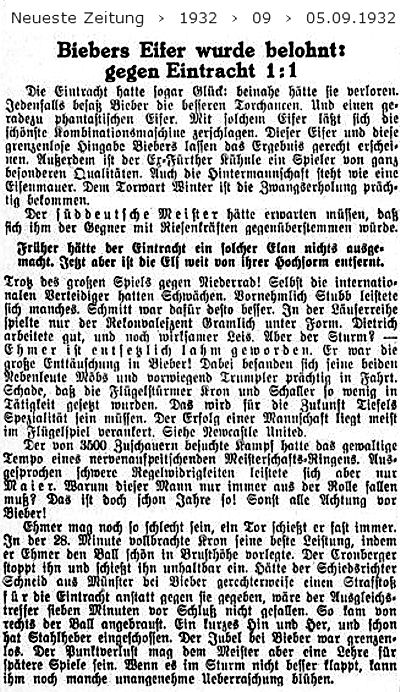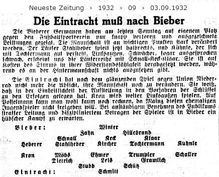 Germania Bieber — Eintracht Frankfurt 1:1 (0:1) Ersparen Sie mir alle Erzählungen von wegen jener bekannten Bieberer Klippe, lassen wir das Ergebnis sprechen. Es besteht zu Recht, man kann sogar noch weiter gehen und sagen, daß die Eintracht am Ende der neunzig Minuten wirklich selbst damit zufrieden war, überhaupt einen Punkt gerettet zu haben. Es lag durchaus im Bereich der Möglichkeit, daß der süddeutsche Meister knapp geschlagen worden wäre. Den teilweisen Mißerfolg darf aber die Eintracht auf Konto ihres Sturmes setzen. Es ist an sich garnichts dagegen einzuwenden, wenn selbst eine internationale Hintermannschaft ein Tor aufgehängt bekommt, aber man sollte doch von dem Sturm einer Meistermannschaft, der zudem noch eine einigermaßen stabile Läuferreihe hinter sich hat, unter allen Umständen verlangen, daß er in 1 1/2stündiger Tätigkeit mehr als eine der zahlreich gebotenen Chancen ausnutzt, selbst gegen die anerkannte Verteidigung Zahn, Hillebrand der Bieberer Germanen. Es scheint doch etwas Wahres darin zu stecken, wenn Frankfurter Sachverständige immer wieder junges Blut an Stelle von Ehmer und Schaller wissen wollen. Diese beiden Stürmer sind in der Tat nicht mehr die alten, sie sind langsam geworden, und Trumpler, der Halbrechte, erreichte mit seinen Tändeleien und seinem Breiten-Spiel nicht viel. Möglich, daß gerade Schaller hierunter viel zu leiden hatte. Die übrigen Eintrachtler taten ihre Schuldigkeit, an ihnen lag es nicht, wenn nichts und nichts klappen wollte. Stubb und Schmidt arbeiteten sogar hervorragend. Als Entschuldigung kann man allenfalls den schlechten, unebenen Platz in Bieber geltend machen, vielleicht ließen sich auch die Frankfurter vorzeitig die Courage abkaufen. Jedenfalls kann und soll der heutige Bieberer Erfolg durch nichts geschmälert werden; selten habe ich die Germanen mit solchem Schneid, mit soviel Energie kämpfen sehen; einfach mustergültig, wie fehlendes technisches Können durch körperliche Anstrengungen ersetzt wurden. Und dabei hatten die Bieberer noch Mannschafts-Experimente vorgenommen, die Läufer (Kühnle, Stahlheber und Maier) wurden zu Stürmern gemacht, die Stürmer (Keck und Schnall) zu Läufern, und man kann sagen, daß dieser Versuch im allgemeinen geglückt ist. Alle elf Germanen haben gleichmäßig zu dem Erfolg beigetragen, eine besondere kritische Würdigung ist daher auch nicht am Platze. Vor ca. 2500 Zuschauern leitete Herr Schneid aus Münster (Nahe) wirklich recht dürftig. Er ließ sich von dem Bieberer Anhang aus der Ruhe bringen, als er bei einem Tor Biebers vorher abseits gepfiffen hatte. Von da ab, besonders aber nach der Pause, machte er den Platzbesitzern Konzessionen, das schlimmste und größte Uebel, das ein Schiedsrichter nur tun kann, und es ist bedauerlich, daß das Bieberer Ausgleichstor längst verdient und im Spielverlauf gerechtfertigt — ausgerechnet aus einem Strafstoß, herrührte, den eigentlich die Eintracht hätte treten müssen! Den Erfolg der Gäste erzielte Ehmer, eine Flanke Krons verwandelnd. Den erwähnten Strafstoß trat Schnall, und Stahlheber lenkte ein. Einen kuriosen Zwischenfall habe ich anzuführen. Beim Ausgleichstor verabreichte ein Bieberer Zuschauer einem Frankfurter, der zwei Meter neben mir saß, eine kräftige und schallende Ohrfeige. Einer der anwesenden Polizeibeamten, der den Namen des Täters feststellen sollte, ein Polizei-Oberwachtmeister der 11. Hess. Bereitschaft in Offenbach, lehnte dies glatt ab!! Christel. (aus dem 'Kicker' vom 06.09.1932)