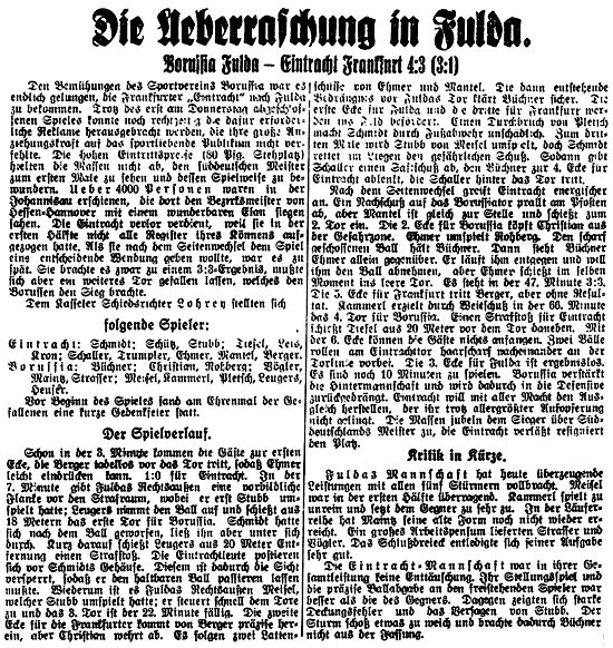 Eintracht Frankfurt in Fulda. Vom Sp. V. Borussia wird uns geschrieben: Wie bereits schon kurz berichtet, ist es der Vereinsleitung des 1. Sp. V. "Borussia" Fulda endlich gelungen, "Eintracht" Frankfurt mit ihrer ersten Mannschaft in ihrer stärksten Aufstellung nach Fulda zu verpflichten. Die Vereinsleitung von Borussia Fulda hat das Risiko in finanzieller Art auf sich genommen, um dem sportliebenden Publikum von Fulda und Umgegend erstklassigen Sport zu zeigen. "Eintracht" Frankfurt gehört zur Elite des deutschen Fußballsports, und wurde in der Saison 1931/32 süddeutscher Meister und Endspielteilnehmer der deutschen Meisterschaft. Der Deutsche Fußballbund hat für das Länderspiel Deutschland-Frankreich am 19. März 1933 in Berlin die Läuferreihe von "Eintracht" Frankfurt mit Gramlich, Leis und Mantel für die deutsche Mannschaft aufgestellt. Dem Fuldaer Publikum ist somit Gelegenheit gegeben, diese drei Auserwählten spielen zu sehen. Das Verteidigerpaar Schütz und Stubb war schon von jeher die Standart-Verteidigung der deutschen Nationalelf; Schütz spielte 11mal und Stubb 9mal für Deutschlands Farben. Der Schweizer Internationale Dietrich hat in der 1. Mannschaft von "Eintracht" Frankfurt auf allen Posten wie Stürmer, Läufer und Verteidiger ganz erstklassige Leistungen gezeigt und spielte in der Schweizer Nationalmannschaft 20mal für die Schweizer Farben. Des weiteren war er berufen, 2mal an der Olympiade teilzunehmen. In der Stürmerreihe mit Trummpler, Hemmerich, Ehmer, Mantel, Kron, ist der Rekordschütze Ehmer vor allem hervorzuheben, denn dieser Spieler verfügt über eine ganz eminente Schußkraft. Der rechte Flügel Trummpler und Hemmerich ist der beste Flügel vom Bezirk Main. Der linke Flügel Kron und Mantel hat sich in den diesjährigen Verbandsspielen um die süddeutsche Meisterschaft sehr gut bewährt. Nun bleibt noch der Torwächter Schmidt. Auch dieser Spieler ist schon des öfteren für Süddeutschland tätig gewesen. All diese großen Könner zu einer Mannschaft vereinigt, geben die Voraussetzungen für eine ganz erstklassige und schlagkräftige Mannschaft. "Borussia" Fulda tritt mit seiner derzeit stärksten Mannschaft an, und hat den Mittelstürmer-Posten durch den Spieler Heuser neu besetzt, so dass der derzeitige Mittelstürmer Pletsch den linken Verteidigerposten einnimmt, und somit die Verteidigung verstärkt wird. Die Mannschaften treten wie folgt an: Eintracht: Schmidt Borussia: Büchner Infolge Verletzung können Bonard und Heßberger in der 1. Mannschaft nicht mitwirken. Das Spiel ist die Generalprobe für die in aller Kürze beginnenden Spiele um die Westdeutsche Meisterschaft, bei der Borussia Fulda wie im vorigen Jahre den Hessen-Hannover-Bezirk zu vertreten hat. Wie soeben bekannt wird, greift Borussia Fulda am 19. März in die Westdeutsche Meisterschaft ein, und spielt voraussichtlich in Kassel gegen den Bezirksmeister vom Niederrhein. (Aus der 'Fuldaer Zeitung' vom 12.03.1933)