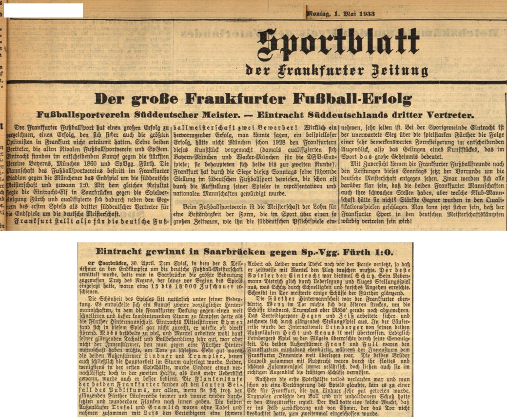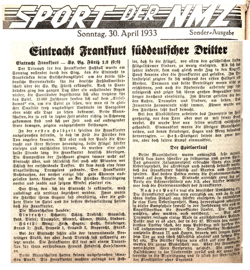 Entscheidung um den dritten Platz In Saarbrücken schlägt die Eintracht die Sp.Vgg. Fürth 1:0 Die Fußballgemeinde des Saargebietes ist dankbar für jedes größere sportliche Ereignis, das ihr geboten wird. Das hat sie noch in jedem Falle bewiesen, sie zeigte ihre Anteilnahme und Begeisterung noch stärker, als es hieß, daß zwei reichsdeutsche Mannschäften von bestem Ruf und Ansehen den bedeutungsvollen Kampf um die dritte süddeutsche Vertreterstelle auf Saarbrücker Boden austragen würden. Durch die anläßlich des „Tages der Arbeit" in einem nie geschauten Ausmaß mit den Fahnen des Reiches und Grün gezierten Straßen der Saarmetropole zogen schon in den Vormittagsstunden Tausende nach dem Sportplatz der SC. Saar 05, dessen treffliche Leitung die Organisation der Veranstaltung veranlaßt hatte. Sicher hat der um die Mittagszeit einsetzende Regen viele Interessenten abgehalten, aber es waren doch gut 15.000 Zuschauer anwesend. Beide Parteien werden sich nicht über das Saarbrücker Publikum beklagen können. Kein Mißton trübte den Eindruck des harten Kampfes, die Saarbrücker schenkten ihre Sympathie beiden Vereinen. Beide Mannschaften wurden bei ihrem Erscheinen auf dem Spielfelde herzlich begrüßt; der römische Gruß der Fürther wurde auf den Rängen besonders freudig erwidert. Der Verlauf des Kampfes ergab einen Wechsel in der durch Anfeuerung von Angriffen zum Ausdruck gekommenen Anteilnahme. In der ersten Halbzeit wurden die mit schönem Feldspiel aufwartenden Fürther aufgemuntert. Nach der Pause, als die Frankfurter lange Zeit sichtlich überlegen waren, schenkte man der Eintrachtself den stärksten Beifall. Der Siegestreffer wurde lebhaft gefeiert, der Erfolg der Frankfurter allgemein als verdient bezeichnet. Das Spiel hat diejenigen Leute, die von den Mannschaften überragende Leistungen erwartet hatten, nicht befriedigt. Die Bedeutung des Kampfes hemmte das Spiel sicherlich. Es wurde beiderseits aufgeregt und vorsichtig gespielt. Aber auch wenn man dies berücksichtigt, kann doch nicht davon abgesehen werden, festzustellen, daß die Spielkultur unserer Spitzenmannschaft zurückgegangen ist. Wir haben in Saarbrücken die Wiener noch zu gut im Gedächtnis und müssen daher bedauernd sagen, da kommen unsere Leute nicht mehr mit. Am stärksten enttäuscht hat die Spielvereinigung Fürth, die gewiß im Saargebiet viele rückhaltlos urteilende Freunde hat. In der ersten Spielhälfte waren zwar schöne Ansätze zu feiner Zusammenarbeit zu sehen. Der Angriff trug einige verblüffend sicher ausgeführte Angriffe vor. (Er sollte ja auch die neue Stärke und Hoffnung der Fürther sein.) Aber die beiden Leupolds und die Flügelstürmer wußten mit den vielen fast mühelos erkämpften klaren Torchancen nichts anzufangen. Im entscheidenden Augenblick wurde jedesmal gezögert. Den einzigen zu lobenden Schuß jagte Frank aufs Tor, der traf aber unglücklicherweise den Pfosten. In der zweiten Halbzeit war der Zusammenhang im Angriff der Kleeblättler vollkommen zerrissen, man sah nur noch Einzelaktionen, die bei der Güte der gegnerischen Verteidigung aussichslos bleiben mußten. Auch in den rückwärtigen Linien war nicht mehr viel von dem Glanz der alten Spielvereinigung zu sehen. Leinbergers Zuspiel war lückenhaft, die Flügelläufer Kraus und Hecht machten mitunter grobe Deckungsfehler. Stärkster Mannschaftsteil war das Schlußtrio. Wenz fand bei seinen entschlossenen Abwehrparaden öfters großen Beifall. Hagen und Zeiß waren sehr sicher bei der Abwehr. Daß Verteidiger und Läufer von Fürth fast immer ungewöhnlich hoch zuspielten, hat verwundert. Besser gefiel schon die Eintracht Frankfurt. Die Frankfurter spielten ruhiger, selbstbewußter, sie haben einige ganz hoffnungsvolle Leute in ihren Reihen. In taktischer Hinsicht hat man bei der Eintracht insofern wohl einen Fehler gemacht, als anfänglich allzusehr defensiv gespielt wurde. Weiterhin wäre es bestimmt besser gewesen, wenn Ehmer und die Läufer mehr den linken Flügel berücksichtigt hätten Es war doch so, daß Lindner in der ersten halben Stunde überhaupt nicht berücksichtigt wurde. Was der Junge kann, zeigte er bei stärkerer Bedienung in der zweiten Halbzeit. Lindner und Trumpler waren die bestem Kräfte im Angriff der Mainleute. Der Rechtsaußen war bei den Angriffen in der zweiten Spielhälfte nicht mehr zu halten. Trumplers Energie und Siegeswillen führten auch zu dem Treffer, der den Sieg an die Farben der Eintracht brachte. Möbs und der auf ihm kaum zusagenden Posten (Halbrechts) spielende Mantel traten weniger in Erscheinung. Auf Ehmer hatten es die Fürther besonders abgesehen, sie ließen den Angriffsführer von Frankfurt nicht zum Schuß kommen. Das entscheidende Uebergewicht hatte die Eintracht in der Läufereihe. Gramlich und Tiefel spielten produktiver und effektvoller als die Fürther Flügelläufer und Leis war, besonders in der zweiten Halbzeit unbedingt, sogar überraschend sehr gut. (Nur könnte er etwas fairer spielen!) Schütz und der für Stubb in der Verteidigung spielende Dietrich hielten die Fürther Stürmer sicher Schach. Beide verstanden sich auch gut mit dem Torwart Schmidt, der sich sehr für den Erfolg seiner Mannschaft eingesetzt hat. In dem von dem Stuttgarter VfB.-Mann Heß ausgezeichnet geleiteten Treffen lagen zunächst die Frankfurter im Vorteil. Beim ersten Angriff kam Ehmer durch, war frei, stolperte aber über den Ball. Bei einem der folgenden Eintrachtsangriffe stand Trumpler abseits. Letzterer lief dann noch mehrfach in die von Hagen gestellte Abseitsfalle. Von der 10. Minute ab erkämpften sich die Fürther eine klare Feldüberlegenheit, die bis zur Pause anhielt. In verschiedenen Situationen, die einen Erfolg der Spielvereinigung erwarten ließen, versagten deren Stürmer im entscheidenden Moment. Der, je näher es zur Pause ging, immer härter geführte Kampf erfuhr in der zweiten Halbzeit insofern eine Wendung, als die Frankfurter nun stärker offensiv wurde