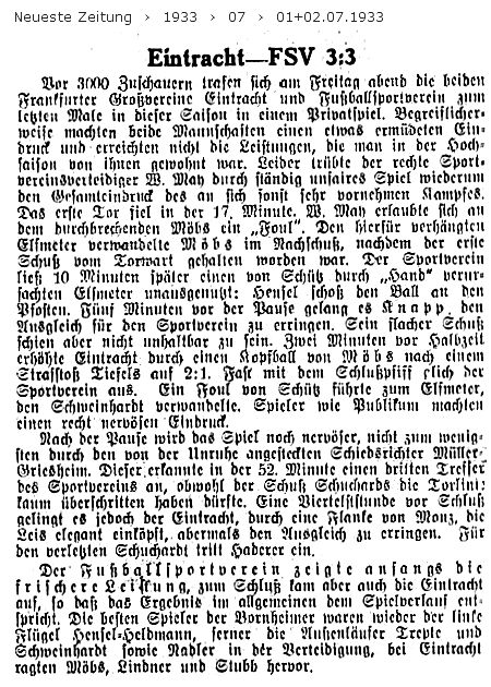 Saison-Ausklang im Fußball Eintracht – Fußballsportverein 3:3 (2:2). Vor 4.000 Zuschauern lieferten sich am Freitag Abend die beiden Frankfurter Spitzenvereine Eintracht und Fußballsportverein am Riederwald nochmals ein Freundschaftsspiel. Das Treffen war sehr eifrig, oft auch sehr derb, es stand aber im ganzen auf einer nur mittelmäßigen Stufe. Bei der Eintracht war die Hintermannschaft ausgezeichnet. Die Läuferreihe hatte gute Momente, aber im Sturm gefielen nur zwei Mann: Lindner und Möbs, die übrigen drei Spieler des Angriffs waren indisponabel. Die Mannschaft des Sportvereins war ausgeglichener. Ihr Sturm war besser, die Verteidigung recht gut, während die Läuferreihe wenig zeigte. In der ersten Halbzeit verwandelte jede Partei einen Elfmeter, während der Sportverein einen zweiten Elfer verschoß. Mit 2:2 ging es in die Pause. Die beiden Treffer der Eintracht erzielte Möbs, dadurch einen durch Elfmeter; für den Sportverein waren Knapp und Schweinhardt (Elfmeter) erfolgreich. Nach der Pause hatte der Sportverein mehr vom Spiel. Bald nach Beginn kam er durch einen Zufallstreffer von Schweinhardt zum Führungstor, versiebte aber viele weitere Chancen, außerdem war die Abwehr der Eintracht gut. Gegen Schluß kam Eintracht wieder auf und durch einen Kopfball von Leis fiel der Ausgleich. Müller-Griesheim als Schiedsrichter war mittelmäßig. (Oberhessischer Anzeiger und Friedberger Zeitung vom 1./2. Juli 1933)