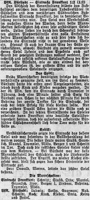 VfR Bürstadt - Eintracht Frankfurt 1:2 (1:2) Bürstadt, 31. Dez. Nach den harten Punktkämpfen der letzten Wochen endlich eine erfreuliche Feststellung: bei dem zu Gunsten der NS-Volkswohlfahrt zwischen dem Tabellenführer der Bezirksklasse von Südhessen V.F.R. Bürstadt und der Frankfurter Sportgemeinde Eintracht vereinbarten Treffen - von beiden Mannschaften trotz des glatten, schneebedeckten Bodens in wirklich vorbildlich fairer Art und Weise durchgeführt - gab es eine derartige Fülle von spannenden Momenten und technischen Feinheiten, so daß die 4000 Zuschauer begeistert waren. Die Frankfurter Mannschaft war ihrem, nicht nur mit großer Aufopferung, sondern auch recht zweckmäßig spielenden Gegner, der seine besten Kräfte in dem Verteidigungsdreieck, dem Mittelläufer sowie den schußfreudigen Innenstürmern hatte, in technischer Hinsicht klar überlegen. Mantels großartiges Außenläuferspiel gab ihr das Gepräge. Dank seiner famosen Aufbauarbeit konnte sich der Linksaußen Berger zeitweise recht gut entwickeln, während Lindner - halblinks stürmend - nach der Pause allzu viel unter den Tücken des Bodens zu leiden hatte. In der ersten Halbzeit sah man auch von Behning, dem entschlossenen Trumpler und von Möbs als Rechtsaußen zweckmäßiges Stürmerspiel, daß leider nach dem Seitenwechsel nicht in gleicher Weise (zuviel Einzelspiel!) fortgeführt wurde, sonst wäre das Endergebnis sicherlich höher ausgefallen. Gramlich erwies sich als ein energischer Mittelläufer, dessen tatsächlich großes Können jedoch weitaus besser in seiner ihm angestammten Position als Außenläufer zur Geltung kommen dürfte. Zipp unterstützt ihn wirkungsvoll. Im Verteidigungsblock beherrschten Stubb und Schmitt i. T. mit erstaunlicher Sicherheit die Situation. Das Ergebnis des Kampfes stand innerhalb von fünf Minuten fest. In der 18. Minute der ersten Halbzeit erzielte Trumpler durch wuchtigen Schuß den ersten Treffer, zwei Minuten später glich Emich für Bürstadt aus und nach weiteren zwei Minuten stellte Behning, nach einer famosen Einzelleistung Trumplers, durch einen zweiten Torerfolg den Endsieg sicher. (aus der 'Frankfurter Zeitung' vom 02.01.1934)