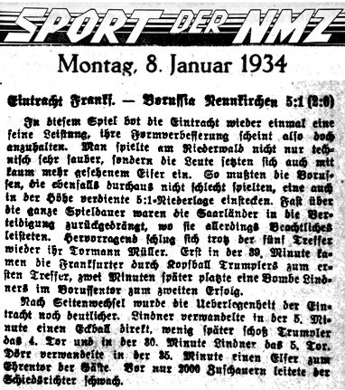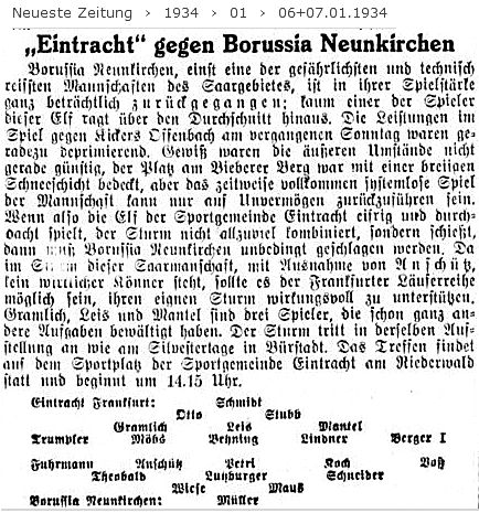 Eintrachts come back [...] Nur 1500 Zuschauer kamen zur Eintracht, die gegen Neunkirchen 5:1 siegte. Gerade wenn die Eintracht einmal etwas zeigt, versäumt es das Publikum, hinzugehen. Dabei war die Formverbesserung des Altmeisters angekündigt. In erster Linie ist das Aufkommen der Riederwälder wohl auf die wieder hergestellte Läuferreihe Mantel-Leis-Gramlich zurückzuführen, die mit alter Routine spielte und damit erfolgreich war, obwohl sich Gramlich offensichtlich zurückhielt und auch Leis noch Rücksicht auf seine Verletzung nahm. Hinter diesen Läufern schonte sich dann noch Stubb, so daß Otto die Hauptarbeit hatte. Man darf überzeugt sein (und wollen hoffen!), daß Stubb und Gramlich gegen Ungarn ein anderes Spiel hinlegen werden... * Überraschend gut spielte sich der Eintrachtsturm ein. Hier kam Lindner halblinks immer mehr in Fahrt, schoß drei schöne Tore, darunter einen Eckball direkt ins Tor und war der beste Stürmer. Fast ebensogut und mit zwei Treffern erfolgreich war Trumppler halbrechts, der jedoch zuerst außen spielte, dann aber mit Möbs tauschte, dem der Wechsel auch gut bekam. Trumppler brachte durch seine Schnelligkeit viel Leben in den sonst schläfrigen Sturm. Wer in diesem von Berger I, Möbs und Behning der schwächste war, ist Geschmacksache... Borussia spielte gefällig und trotzdem schlecht. Es fehlte die Wirkung. Ihr Ehrentreffer entstand aus einem ungerechtfertigten Elfmeter am Schluß des Spiels. Trotzdem fielen einige Spieler angenehm auf. So besonders der alte Internationale Voß am rechten Flügel, der Stubb oft überspielte, und der Halblinke Anschütz, ferner der ausgezeichnete Torwart Müller. (aus dem 'Fußball' vom 09.01.1934)