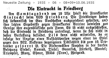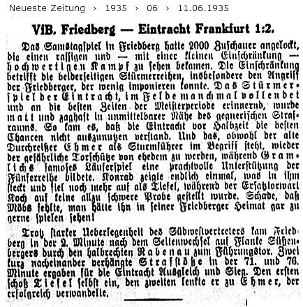 VfB. Friedberg - Eintracht 1:2 Vor 2000 Zuschauern gelang am Samstagabend der Eintracht in Friedberg gegen den ehrgeizigen VfB. ein knapper und glücklicher Sieg. Beide Mannschaften spielten recht gut, doch waren beiderseits die Stürmer recht schußschwach. Vor dem Wechsel dominierten die Frankfurter, ohne aber zu Erfolgen kommen zu können. Nach dem Wechsel drängten zunächst die Friedberger, die auch durch Rabenau den Führungstreffer holten. Tiefel konnte eine Viertelstunde vor Spielschluß einen 16-Meter-Strafstoß zum Ausgleich auswerten, einen zweiten Strafstoß schob Tiefel zu Ehmer, der den zweiten Treffer für die Eintracht erzielte. Gramlich und Konrad bei Eintracht, die beiden VfB-Verteidiger Steitz und Ebner sowie der Tormann Friedbergs, Wittmann, waren die besten Spieler auf dem Platze. (aus dem 'Frankfurter Volksblatt' vom 11.06.1935)