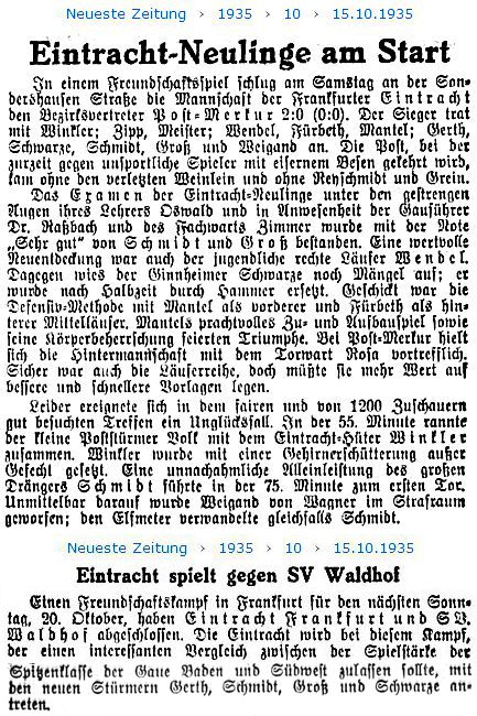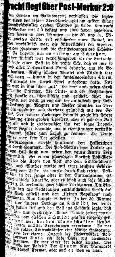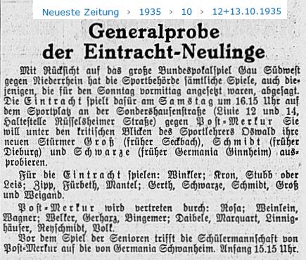 Heute Post-Merkur - Eintracht. 16:15 Uhr Fußball-Gesellschaftsspiel Um durch die sonntägliche Fußballsperre nicht 14 Tage untätig zu sein, haben die beiden Lokalvereine Post-Merkur und Eintracht-Frankfurt ein Gesellschaftsspiel für den heutigen Samstag vereinbart. Das Spiel beginnt um 16:15 Uhr auf dem Sportplatz des Postsportvereins an der Ackermann-Schule. Eintracht will dabei ihre neuen Leute, die für die Verbandsspiele noch nicht spielberechtigt sind, ausprobieren und ihnen Gelegenheit geben, sich in die anderen Mannschaftsteile einzufügen. Es sind dies Schmidt, Groß, Gerth und Schwarze, die der Eintracht-Mannschaft sicher eine Stärkung geben. Der Platzbesitzer wird diesem starken Gegner mit seiner kompletten Elf gegenübertreten, jedoch muß er für seinen verletzten Torhüter Volmerg (oder Bolmerg?) den Ersatzmann Roja einstellen. Man wird also gespannt sein, wie dieses sehr interessante Treffen durchgeführt und beendet wird. Aller Voraussicht nach ist aber mit einem sicheren Sieg der Gäste zu rechnen." ('Frankfurter Volksblatt' vom 12.10.1935)