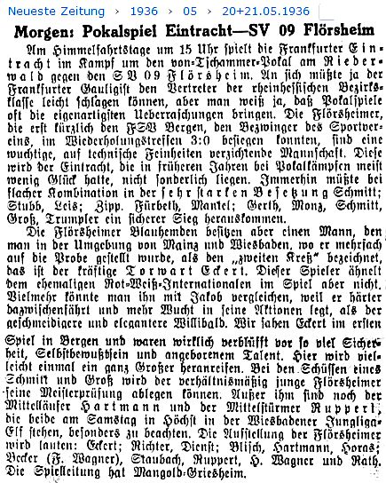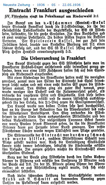 [...] In Frankfurt aber hat man die Eintrachtpokalniederlage, die gegen Flörsheim auf eigenem Platz geschah, begreiflicherweise noch nicht verdaut. Am nächsten Samstag empfangen wir den Club, er sollte gegen die Eintracht spielen, aber die Leute vom Riederwald haben wohlweislich jene vom Riederbruch um eine Verstärkung gebeten, und der FSpV. wird also vier Mann abstellen. (aus dem 'Kicker' vom 26.05.1936)
