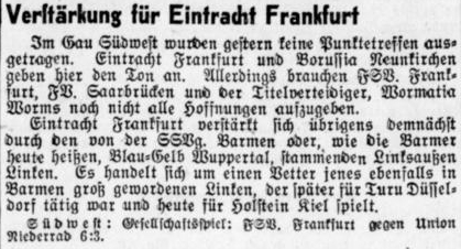 Temperamentvolles Freundschaftsspiel in Ronhof Die Fürther haben sich den allgemeinen Ruhetag zu Nutze gemacht und in der Frankfurter Eintracht einen guten Partner zu einem Freundschaftsspiel gefunden. Die Kleeblätter wollten der staunenden Mitwelt zeigen, daß sie es trotz vieler Zwischenrufe fertig brächten. zweimal hintereinander mit der gleichen Mannschaft zu spielen. Seit Jahresfrist ist das nämlich nicht mehr vorgekommen. In Wirklichkeit handelte es sich bei den Fürthern darum, einmal den freien Tag auszunützen und gleichzeitig die in Augsburg für gut befundene Aufstellung auf Herz und Nieren prüfen zu lassen. Die Mannschaft hat diese Probe noch nicht mit Lob bestanden. Wenigstens nicht auf Anhieb. In der zweiten Halbzeit, als sich die Frankfurter mehr auf Halten des eintorigen Vorsprunges beschränkten, da zogen die Kleeblättler jedoch so vom Leder, daß man ihnen schon eher die Zustimmung zur Beibehaltung der Aufstellung erteilen vermöchte. Abgesehen von den zu verbessernden Schußleistungen lief das Spiel größtenteils richtig. Nur einen Einwurf: Die Deckung des gegnerischen Rechtsaußen wurde zeitweise sträflich vernachlässigt. Richtlinien heraus! Die Eintracht hatten wir uns genau so vorgestellt, wir hatten sie vom letzten Gang in Fürth noch gut in Erinnerung. Kräftige Gestalten, raumgreifendes Spiel. Schmitt als Halblinker hielt sich weit zurück. Die Außenstürmer sehr schnell, der nach Halbzeit eingesetzte Röll noch besser als Hemmerich. Im Feldspiel die andern nicht überragend ist Wirsching vor dem Tor der gefährlichste Mann. Seine zwei Tore bestätigen es deutlich. Ihre besten Gelegenheiten bekamen die Eintrachtler in der Zeit, als die Fürther mit Hochdruck auf den Ausgleich hin arbeiteten, da kamen Linken, Wirsching und Röll zu Schußgelegenheiten, die sie nicht voll ausnützten. Ein schönes, spannendes Spiel, ein wenig zu hart, fast einem Punktspiel vergleichbar. Wir möchten die Eintrachtler mal in voller Kriegsbemalung sehen, diesmal spielten einige nur auf Probe. Zu notieren: Nach der Pause tauscht bei Eintracht Hemmerich mit Arheilger, dieser geht ins Sturmzentrum, am rechten Flügel erscheint Röll. (aus dem 'Kicker' vom 23.11.1937)