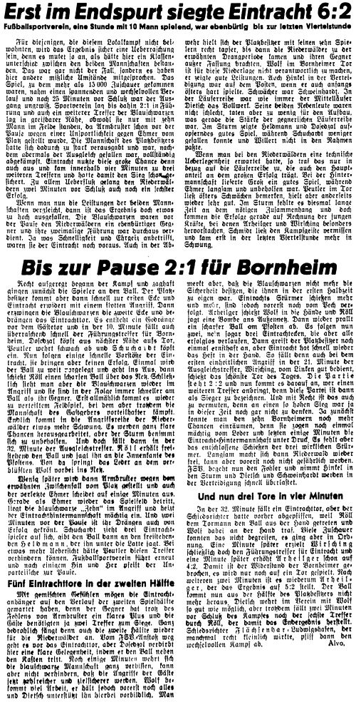 Wirsching lieferte eine große Partie Die Eintracht gewann ihr Derbv gegen den Fußballsportverein 6:2. Die Leser werden zugeben: dies ist eine Sensation. Ich aber sage: es ist keine. Sie gewannen es auf dem Platz des Gegners vor 17.000 Menschen. Man wird sagen, das sei keine besondere Sache, denn auf dem Bornheimer Feld habe sich die Eintracht von jeher am wohlsten gefühlt. Das stimmt: auf eigenem Platz spielte sie nämlich im Vorspiel 2:2. Die Sensation aber steckt darin, das der Fußballsportverein 25 Minuten vor Schluß noch 2:1 führte und doch so gewaltig geschlagen wurde. Es kommt noch toller. Er hatte diese Führung ertrotzt, obwohl er beim 1:1-Stand seinen blendenden Rechtsaußen Armbruster verlor. Und schließlich kommt das Unglaublichste: bei 2:2 schoß die Eintracht innerhalb von nicht ganz drei Minuten drei Tore. Stubb war nicht mitangetreten: für ihn spielte Ehmer. Es gibt für sein Fehlen (außer der Tatsache einer Knöchelverletzung) eine reizende Entschuldigung. Eine Entschuldigung, die mir vorkommt wie ein sanftes Blümchen am rauhen Rand der Punktespiele. Der linke Verteidiger ist ein besonders guter „Spezi" des Rechtsaußen vom Fußballsportverein. Und weil Hennes Stubb und der Bubi Armbruster im Leben die besten Freunde sind, meinte man, der Stubb ginge gegen seinen Freund (ganz unbewußt) nicht mit jener Entschiedenheit vor, wie das eigentlich gegen einen so gefährlichen Fachmann sein müsse. Aber der Armbruster spielte nur 34 Minuten. Dann trat er dem Stubb-Ersetzer Karl Ehmer so heftig ans Knie, daß ihn der Schiedsrichter schleunigst in die Kabine schickte. (Denn vom Ball war weit und breit nichts mehr zu sehen.) Die 17000 kamen aus der Aufregung nicht heraus. Die Eintracht kam zunächst gar nicht ins Spiel, und als sie endlich den Ausgleich hingebracht hatte, und Armbruster draußen war, und es jetzt also ein Zuckerlecken für die Riederwälder geben sollte (wie manche Leute sich dachten), da ging der Daller Heldmann hm und stellte sich allein und verträumt vorm Tor auf und wartete, bis ihm der heftig bewachte Schuchardt das Leder hinlegte. Und dann hieb er es hinein, ohne zu placieren, aber so kräftig, daß Peutler fast die Kappe von den Ohren fiel. So kam es, daß Bornheim 2:1 führte und die vielen Anhänger der alten Meistermannschaft sehr glücklich waren. Aber dann schoß die Eintracht den Ausgleich, 20 volle Minuten nach der Pause. Solange hatten die zehn Bernemer wacker getrotzt. Und bei 2:2 schien es zu bleiben. Bis von der 33. bis zur 36. Minute die Eintracht in einen wahren Taumel geriet und Wirsching, Arheilger und noch einmal Arheilger das 5:2 besorgten, das dann knapp vor dem Ende durch Röll ein 6:2 wurde. Was mir am meisten aufffiel: die großartige Weise, wie sich Wirsching im Feld bewegte, klug, schnell, instinktsicher im Spiel mit und ohne Ball. Dann, wie lange es dauerte, bis Adam Schmitt ins Spiel kam. Dann die unverschnörkelt nützliche, bescheidene und gute Snielweise des Linksaußen Linken. Dann, daß Armbruster sich zu der Dummheit hatte hinreißen lassen, die von dem bekannt fairen Spieler völlig unerwartet kam. Dann: die gute Unterbringung der Zuschauer. Und die Fairneß der Mannschaften, die sich bei aller Dramatik des Kampfes immer zu beherrschen wußten. (aus dem 'Kicker' vom 18.01.1938)