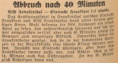 Eintracht-Spiel abgebrochen VfR. Frankenthal - Eintracht Ffm. 1:1 Eigenbericht für das Volksblatt 3000 Zuschauer wohnten dem Spiel in Frankenthal bei, das bis zur 38. Minute einen ausgezeichneten und spannenden Verlauf genommen hatte, bis ein gewaltiges Unwetter den Platz derart unter Wasser setzte, daß an ein Weiterspielen nicht mehr zu denken war. Am Mittwochabend findet das Spiel in Frankfurt seine Wiederholung. Eintracht legte gleich forsch los und Frankenthal hatte