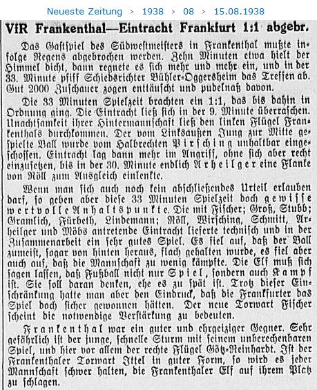 Das war alles andere als ein guter Anfang. Ueber dem Gau Südwest tröpfelts mehr und minder schon die ganze, liebe Woche lang, und der Sonntag bildete durchaus keine Ausnahme davon. Der Wettergott scherte sich wenig darum, daß der Fußball wieder einmal ins Rollen kommen sollte. Er kam zwar auch so ins Rollen, aber die Groschen und Märker, die die Kassierer der Fußballvereine nach einer Sommerpause doppelt gerne sehen, kamen noch spärlich ins Rollen. Nun, man wird nicht gleich am Anfang mit dem Schicksal hadern, größere Tage stehen uns bevor, schon am nächsten Sonntag, wenn die Eintracht im Sportfeld den jungen deutschen Meister Hannover 96 erwartet, wird sich das Fußballvolk in Bewegung setzen. Die Eintracht spielte nur eine halbe Stunde. Die Eintracht als Gaumeister hatte sich für den Beginn ein „Spielchen" ausgesucht. So leicht wäre es immerhin nicht gewesen, beim VfR. Frankenthal zu gewinnen, der mit Ittel, Pfirsching und Reinhardt drei Spieler von Rang in seinen Reihen aufweist. Der übrigens mit den Riederwäldern gewissermaßen verschwägert ist, da er jetzt auch von Oßwald trainiert wird. 2000 Zuschauer hatte der Gaumeister trotz des schlechten Wetters angelockt, die auch durch feines Können der Frankfurter entzückt wurden. Aber die Eintracht spielte und verspielte sich lange, ließ Pfirschings Führungstor über sich ergehen und wurde erst allmählich energischer, worauf ihr denn auch in der 30. Minute durch den diesmal im Sturm aufgestellten Arheilger das Ausgleichstor gelang. Aber das Wasser, das Wasser! Es regnete so munter, daß drei Minuten später der Vorhang fiel und die Frage offen blieb, wann und ob sich die spielerische Ueberlegenheit gegen den männlichen Kampfgeist der Pfälzer durchgesetzt hätte. (aus dem 'Kicker' vom 16.08.1938)