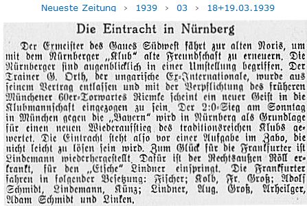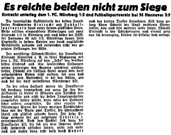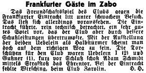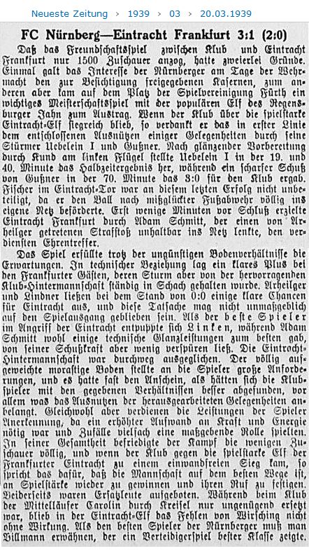 Der „Klub" empfing vor 1000 Zuschauern im Zabo die Eintracht Frankfurt auf katastrophal aufgeweichtem Platz. Schlug ihre Gäste, die in der ersten Halbzeit klar überlegen spielten, aber insgesamt sich in Überkombinationen verloren, 3:1 durch Tore von Übelein II (2) und Gußner. Frankfurts Ehrentreffer: Schmitt. (aus dem 'Fußball' vom 21.03.1939)