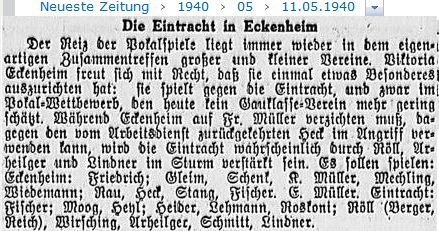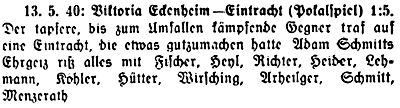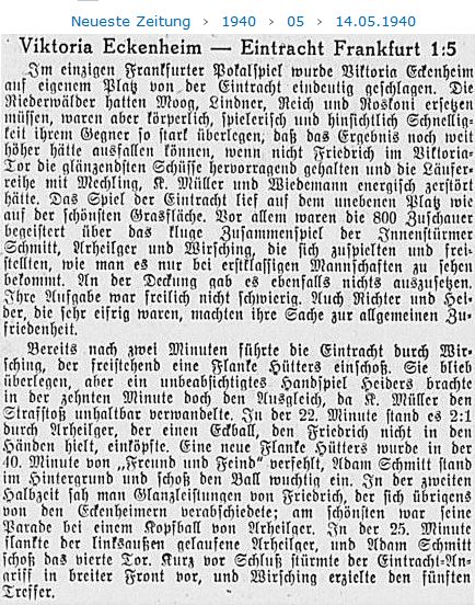 Eintracht Frankfurt gewann in Eckenheim gegen Viktoria sicher und klar mit 5:1. Der Sieg der Riederwälder war von vornherein eine gegebene Sache. Adam Schmidt (2), Wirsching (2) und Arheilger erzielten die Treffer. Wenn es nicht mehr wurden, so lag das an dem etwas kleinen Platz und an der famosen Arbeit des Eckenheimer Tormannes Friedrich. Das Gegentor erzielten die Platzherren durch Elfmeter. (aus dem 'Kicker' vom 14.05.1940)