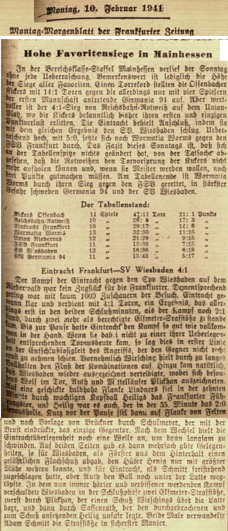 Am Riederwald sahen 1000 Zuschauer ein seltsames Spiel. Sicher, die Eintracht war besser, das war immer zu erkennen. Doch war ihr Sieg bis zur 43. Minute der zweiten Halbzeit alles andere als eine unterschriebene Sache. Nachdem Heilig zwei Tore gemacht hatte, die von der Gegenseite bei größerer Aufmerksamkeit leicht hatten vermieden werden können, holte Schulmeyer auf Bruckners Flanke einen Gegentreffer heraus. Die Eintracht kam dann zu nichts mehr, und zwei Minuten vor Schluß schien ein Punkt flöten, doch Siebentritt fand drei Meter vor dem Tor allein auf weiter Flur das Loch nicht. Und dann gab es noch zwei Elfmeter für Eintracht, einen wegen Hand und einen wegen Foul, und beide besorgte Adam Schmidt mit gehöriger Wucht hinein. Das Ergebnis nahm so Formen an, die dem Spielverlauf und dem Widerstand der Geschlagenen nicht ganz gerecht werden. Wiesbaden hätte in diesem Kampf leicht eine Sensation schaffen können, wenn das Spiel seiner Außenstürmer klüger gewesen wäre. Schulmeyers schlechtes Platzhalten — es zieht ihn immer wieder in die Mitte — verdarb manche gute Chance. (aus dem 'Kicker' vom 11.02.1941)