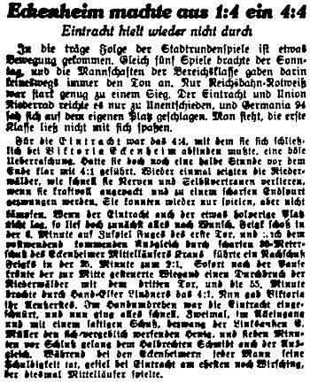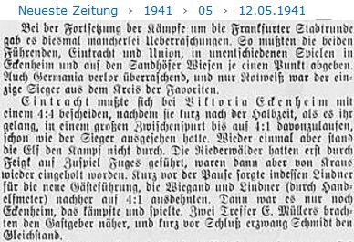 Eckenheim trotzt Eintracht Frankfurt (4:4) In der Frankfurter Stadtrunde sind Bereichsklasse und erste Klasse gemischt. Es geht nun schon eine ganze Zeit so, daß die Bereichsklasse keinen „Blumentopf" erben kann. Der einzige Verein der Bereichsklasse, der an diesem Sonntag siegen konnte, war Reichsbahn-Rotweiß, dem ein 5:0 gegen die TSG. Höchst gelang; in dieser spielen einige Gastspieler, darunter der Mannheimer Konrad, und ihr Widerstand war auch nicht gering. Drei Tore schoß Debus, der zurückgekehrte Stürmer der Bockenheimer, die beiden übrigen kamen auf das Konto des Rechtsaußen Kircher, der seinen „guten Tag" hatte. Dagegen mußte die Eintracht in Eckenheim mit einem 4:4 zufrieden sein, und das war um so erstaunlicher, als sie in der zweiten Halbzeit 4:1 führte, aber da kam ein Spürtchen, dem die Eintracht nicht mehr gewachsen war. Feigk, Lindner, Wiegand und nochmals Lindner (Handelfer) schossen die Tore der Riederwälder. (aus dem 'Kicker' vom 13.05.1941)
