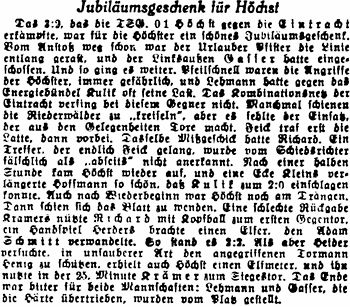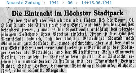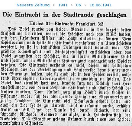 In der Frankfurter Stadtrunde führt weiter die Union Niederrad, die in Fechenheim 6:0 gewann. Mit dem gleichen Ergebnis erreichte der FSV. den zweiten Tabellenplatz, der gegen Viktoria Eckenheim gewann. Die Bornheimer gefielen vor der Pause, nachher ließ vor allem der Innensturm nach. Gut wieder die Läuferreihe Böttgen—Wolf—Friedrichsmaier. Trapp, Höhner, Albert (2), Kleim schossen fünf Tore, zu denen ein Selbsttor kam. Die Eintracht verlor in Höchst 2:3. Die Höchster, die ihren 40. Geburtstag feiern, strengten sich mächtig an, waren schnell und entschlossen, während die Eintracht wieder einmal „in Schönheit erstarb". 2:0 führten bei Halbzeit die Höchster durch Gasser und Kulik, den Ausgleich besorgten Richard und Schmitt (Elfmeter), ebenfalls ein Elfmeter brachte durch Krämer den Sieg. Leider wurden zum Schluß Lehmann-Eintracht und Gasser-Höchst vom Platz gestellt. (aus dem 'Kicker' vom 17.06.1941)