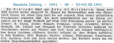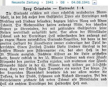 13 Südwest 13 Jetzt führt FSV. In der Frankfurter Stadtrunde hat der Fußballsportverein jetzt die Führung übernommen, da Reichsbahn-Rot-Weiß wegen seines Tschammerpokalspiels in Metz wieder nicht beteiligt war. Der FSV. war technisch und taktisch im Kampf gegen den SV. Heddernheim überlesen und siegte 50; [...] Die Eintracht siegte in Griesheim 4:1. Von der Schalke-Form fehlte einiges, das lag aber daran, daß Moog. der am gleichen Tage heiratete, und der erkrankte Adam Schmitt fehlten. Lindner (3) und Kistner schossen die Tore, deren erstes von Heß ausgeglichen wurde. So war also bei der Eintracht neben Stubb und Trumpler auch Lindner wieder aufgetaucht, und wenn man dazu berichtet, daß am gleichen Tag in der Eintracht-AH., die gegen die Adlerwerke 5:4 gewann, kein anderer als Bernhard Kellerhoff auf Linksaußen die Linie entlang raste, so zeigt sich, daß die Tradition heute bei der Eintracht hoch im Kurs steht. (aus dem 'Kicker' vom 05.08.1941)