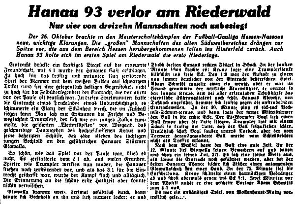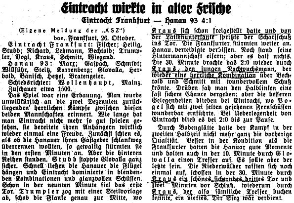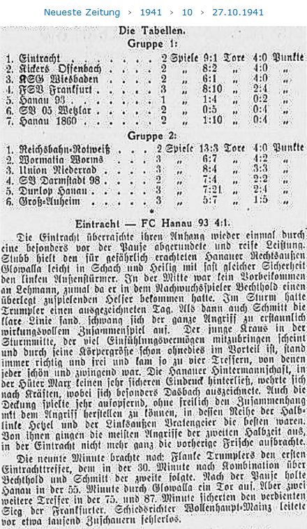 In Hessen-Nassau sind die Spiele nun auch ins Rollen gekommen. Ein großes Programm ist zu erledigen. Zwölf Teilnehmer stehen im Wettbewerb. Vorerst erhebt sich die Frage, wie sich die zum Main zurückgekehrten Hanauer Vereine mit den Frankfurtern schlagen werden. So stand das Treffen Eintracht gegen Hanau 93 im Vordergrund. Der glatte Sieg der Frankfurter von 4:1 Toren kommt fast überraschend. Es scheint, daß die erste Konkurrenz für Frankfurt-Offenbach eher wieder in Südhessen zu suchen ist. (aus dem 'Kicker vom 28.10.1941)