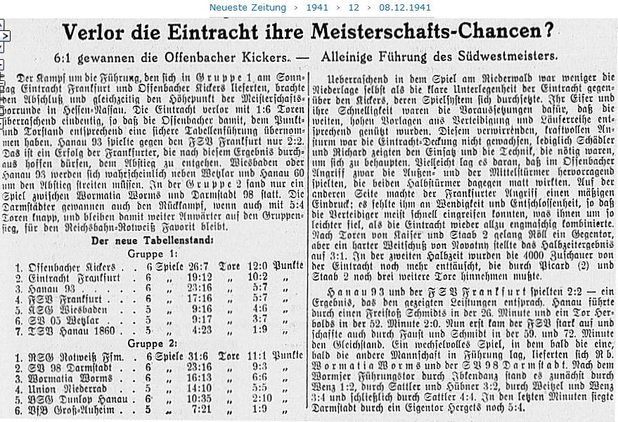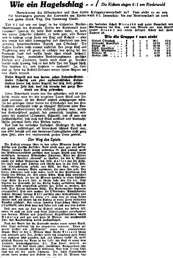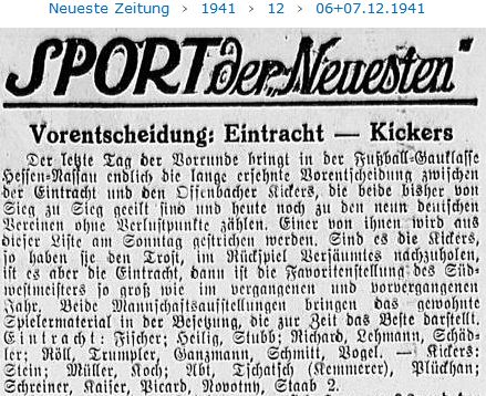 Offenbacher Kickers wieder vorne Das Ereignis in Hessen-Nassau war die Begegnung zwischen Eintracht Frankfurt und den Offenbacher Kickers. Die Eintracht hatte zuvor den FSpV. dank ihrem besseren Sturm 3:1 bezwungen, sie hatte auch die schwere Klippe in Wiesbaden erfolgreich (2:1) hinter sich gebracht und fühlte sich stark genug, dem alten Rivalen aus Offenbach die Stirn zu bieten. Allein die hochgeschraubten Frankfurter Hoffnungen sind zerronnen wie Butter in der Sonne — am Ende hieß es 6:1 für die Kickers! Deren stadtbekannte Tugenden, ihre Schnelligkeit, ihr Schneid, ihre Kampfkraft, setzten sich wieder einmal überzeugend durch, während die Eintracht gerade da verletzbar war, wo man ihre Stärken vermutet hatte. Hennes Stubb, gegen den FSpV. einer der Besten auf dem Platz, konnte den kleinen Schreiner am rechten Flügel der Kickers nicht halten, und Mittelläufer Lehmann war gegen die tüchtigen Innenstürmer Staab II und Piccard nicht wendig genug. Im übrigen das zwischen diesen Rivalen schon gewohnte Bild: die Eintracht wollte spielen, die Kickers kämpften! Sie stehen nun allein an der Spitze, und wenn auch noch nicht aller Tage Abend ist, werden sie sich, wie wir sie kennen, kaum mehr verdrängen lassen. (aus dem 'Fußball' vom 23.12.1941)