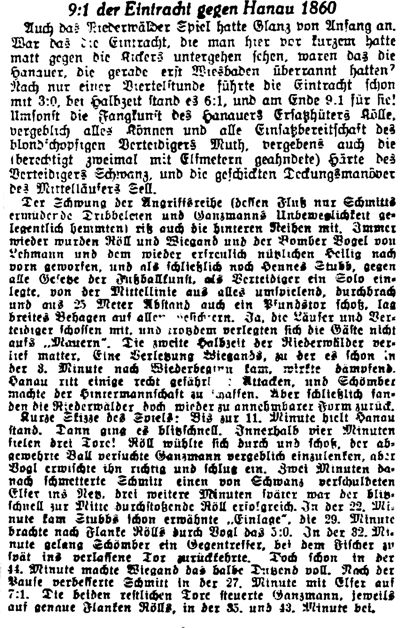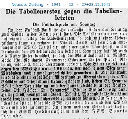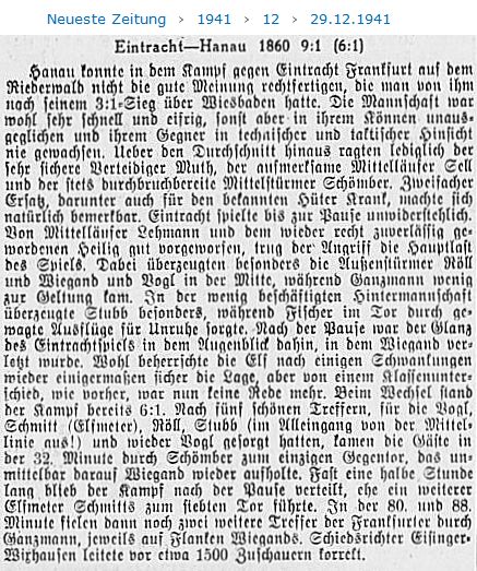 In den hessischen Gauen verteidigen die Meister ihren Titel mit hohen Ergebnissen. Borussia Fulda ist überhaupt der sicherste Spitzenreiter, und die Offenbacher Kickers haben zwar die Eintracht nur zwei Punkte hinter sich, aber das Rückspiel am Biebererberg. Was das zu bedeuten hat, wissen die mainischen Fußballfreunde sehr wohl. Zeichnete sich zuletzt Picard unter den Kickerstürmern aus, so heute der kleine Rechtsaußen Schreiner. Beim hohen Eintrachtsieg schoß Hennes Stubb als Verteidiger ein Tor durch keinen Weitstoß wie dazumal gegen Ungarn, sondern nach einem Dribbling übers halbe Feld. (aus dem 'Kicker' vom 30.12.1941)
