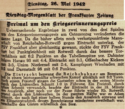 Eintracht gewann am Brentanobad 3:2, — doch sah es lange nicht so aus. Schon in der ersten Minute schellte es im Eintrachttor — Kircher hatte den Torwart angeschossen und der Linksaußen Schmitt machte die Sache fertig. Zwar glich Adam Schmitt mit einem mehr als fulminanten Freistoß aus, aber noch ehe Pause war, lag Rotweiß wieder mit der Nase vorn: derselbe Schmitt vom ersten Tor hatte einen saftigen Schuß als 2:1 besorgt. Später, in der zweiten Hälfte, schoß Adam Schmitt (es war ein Tag der Schmitts!) den Ausgleich, der um diese Zeit wohlverdient war. Doch um das Siegestor der Eintracht, einen Elfer, gab es Pfeifen und Pfuirufe, jenen häßlichen Diskant in einem sonst spannenden heftig hin- und herhetzenden Spiel. Es ging um ein Foul von Eufingen — ob es nämlich eines war oder nicht. Wir haben uns an die schiedsrichterliche Ansicht zu halten, nämlich an die Tatsache. (aus dem 'Kicker' vom 27.05.1941)