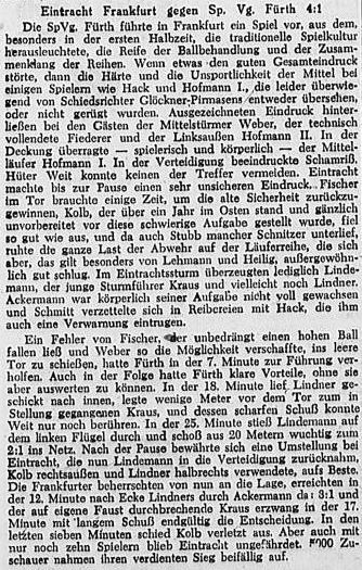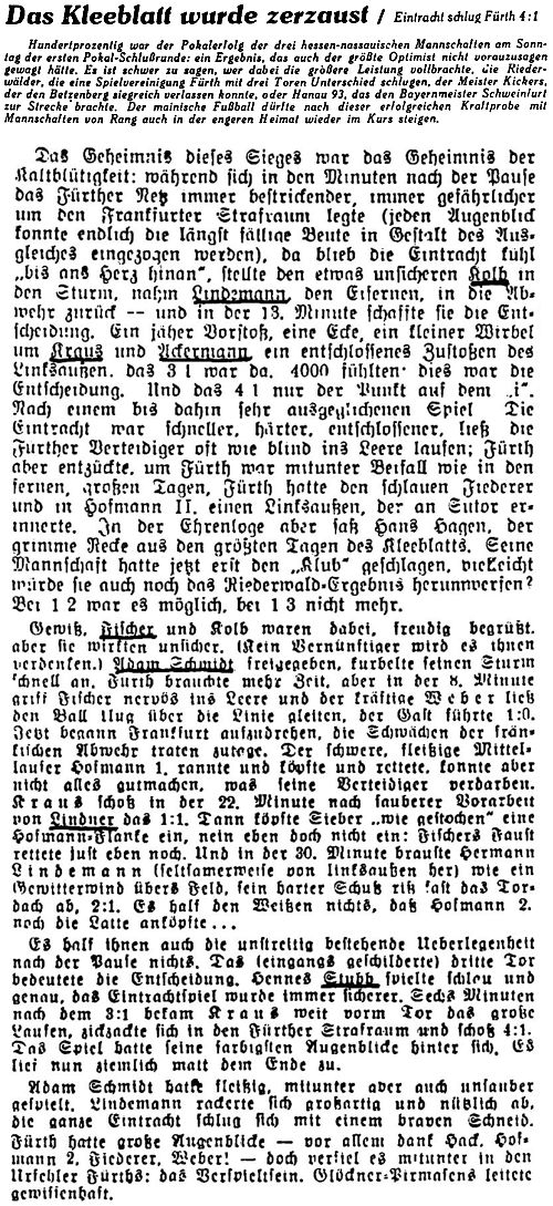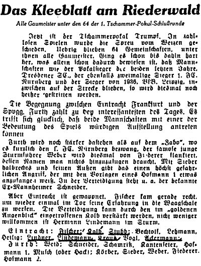 Eintracht Frankfurt — Spielvgg. Fürth 4:1 Die Frankfurter Eintracht konnte gegen die „Kleeblätter" die auf Urlaub befindlichen Stammspieler Fischer, Kolb und Lindemann einsetzen, die ihre Schlagkraft erhöhten. Kolb befriedigte zwar als Verteidiger nicht und gab seinen Platz in der zweiten Hälfte an Lindemann ab, aber alles in allem lieferten die Frankfurter doch eine gute Partie und wurden verdient Sieger. Gute Einzelkräfte waren Lehmann und Heilig in der Läuferreihe sowie Schmitt und Lindemann im Sturm. Die Gäste enttäuschten und hatten in der Abwehr die größten Schwächen aufzuweisen. Der rechte Sturmflügel Fiederer-Hoffmann II und Mittelläufer Hoffmann genügten allen Ansprüchen. Die Fürther kombinierten in der ersten Hälfte recht gut, hatten leichte Feldvorteile aber trotz dem Führungstor durch Weber kamen die Einheimischen durch Treffer von Kraus und Lindemann mit 2:1 beim Wechsel in Front. Nach Wiederbeginn hatte die Eintracht klare Vorteile, was sich auch durch zwei weitere Tore von Ackermann und Kraus zahlenmäßig ausdrückte. (aus dem 'Fußball' vom 21.07.1942)