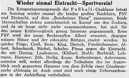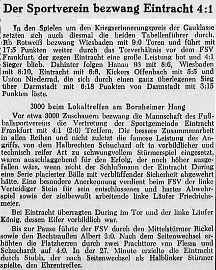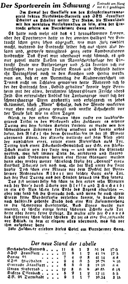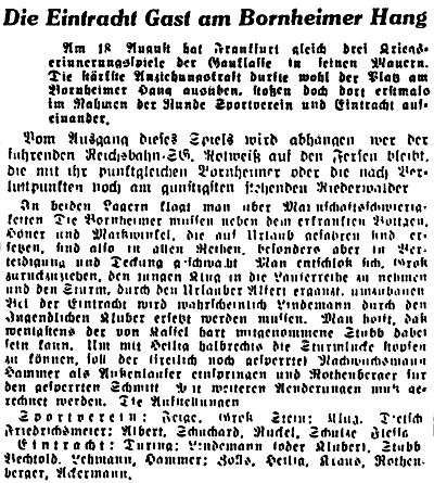 HESSEN-NASSAU „Spörtler" schlugen die Eintracht 4:1 Die Eintracht sonnte sich seither in der Gewißheit, daß sie von allen Vereinen, die den Kriegserinnerungspreis gewinnen wollen, die wenigstens Verlustpunkte hatte. Damit ist es nun auch zu Ende, am Bornheimer Hang gewann von 2500 Zuschauern der Sportverein 4:1, und es hätten der Tore noch mehr werden können, wenn vom 4:0 ab der Sportverein nicht so zerfahren gespielt hätte. Die Eintracht war matt, vor allem im Sturm, aber sie war auch schlimmer geschwächt als der Erzrivale, der mit großer Frische übers Feld stürmte. During — der ja in Kassel schon glänzte — tötete viele scharfe Bälle. Rickel und Albert schossen die schwarzblauen Tore vor der Pause, Flessa und Schuchardt nach dem Wechsel. Dann kam eine Weile gar nichts und schließlich ging Hennes Stubb in den Eintrachtsturm, um ihm ein bißchen mehr Schwung zu verleihen. Das brachte der „alte" Nationalspieler auch wirklich fertig, mehr noch er schoß das Ehrentor so schlank und sauber, daß es sich wohl mit dem Albertschen Gewaltschuß vor der Pause messen konnte. (aus dem 'Kicker-Fußball' vom 18.08.1942)