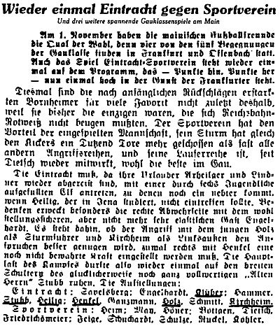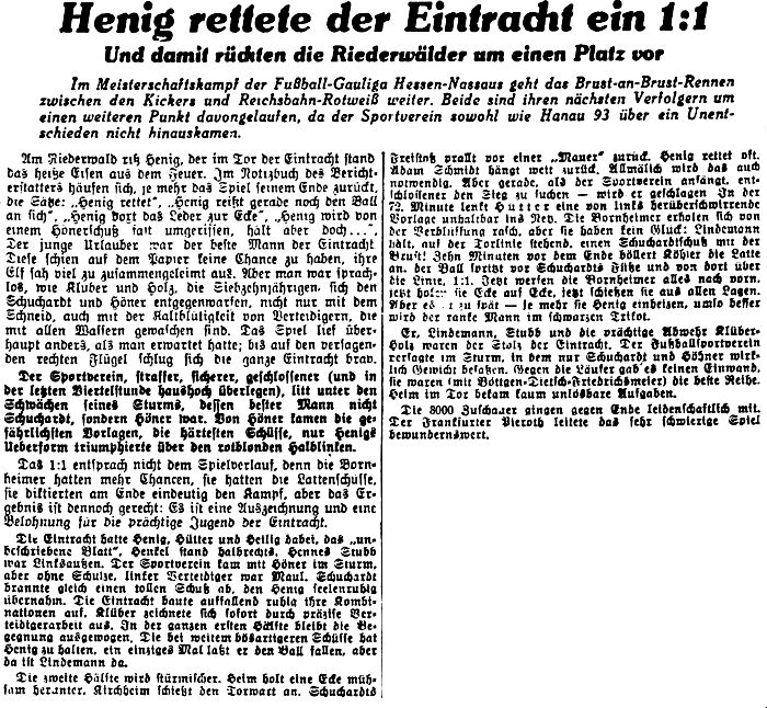 Unentschieden kämpften Eintracht und FSV. Frankfurt Es war der alte spannende Rivalenkampf wie je Es wurde doch ein Schlager, das Nachbarnspiel Eintracht — Sportverein in Frankfurt, das ebensoviel Tradition hat wie etwa Club — Kleeblatt. Diesmal, so rechnete man sich aus, hat die Eintracht keine Chance. Die jungen Riederwalder fühlten nun so etwas wie ein Geborgensein, sie glaubten, um einen Punktgewinn kämpfen zu können, und sie behielten recht dabei. Selten ist ein Spiel dramatischer verlaufen als dieses, das die 3000 Zuschauer restlos in seinen Bann zog. Torwächter Henig, der übrigens ein „Riederwälder Bub" ist — aus jener kleinen, waldumsäumten Siedlung hinter dem Eintracht-Platz —, zeigte phantastische Paraden. Der junge Klüber und Holtz verteidigten prächtig. Lindemann bewährte sich als der große Retter in höchster Not, mit der Brust einmal, ein anderesmal mit dem Kopf schlug er Schüsse Schuchardts aus dem leeren Tor. Der Sturm der Riederwälder ließ es an Erfahrung und Eingespieltsein noch fehlen, lediglich Hennes Stubb, der diesmal als Linksaußen herumspazierte — das hat er früher auch oft und gerne gemacht — war noch der einzige Spieler, von dessen Aktionen Gefahren ausgingen. Bei den Bornheimern war alles mehr ausgeglichen. Mittelläufer Dietsch war der große Lenker, im Sturm hatte Schuchardt einen großen Tag, und von ihm angesteckt waren auch Höner und Rückel in Fahrt. Aber alles war umsonst. Mochten sie am leeren Tor stehen, immer wieder erstand ihnen noch ein Gegner, mochte Henig von einem Schuß Rückels umgeworfen werden, er gab nicht klein bei, und so adelt die große Angriffsleistung Bornheims die erfolgreiche Abwehr der Riederwälder. Die Tore ließen lange auf sich warten. Die erste Halbzeit hatte außer gefährlichen Freistößen Schuchardts wenig gebracht, was zu einem Erfolg hätte führen können, um so mehr dann die zweite. Es war überraschend, als in der 27. Minute die Eintracht führte. Stubb hatte nach innen gespieltt, Hütter auf rechts außen freistehend eingefunkt. Nun aber hätte man den Sporverein drängen sehen sollen! Und in der 35. Minute war auch der Ausgleich nach einem Lattenschuß Köhlers durch Schuchardt besorgt. Nicht mehr, nicht weniger! Der Sportverein drängte noch weiter, aber die Eintracht-Deckung, der sich Stubb noch zugesellte, biß die Zähne aufeinander. (aus dem 'Kicker-Fußball' vom 03.11.1942)